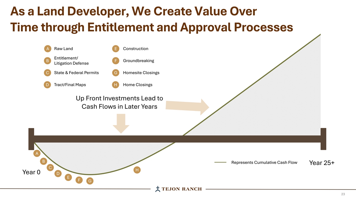 作为土地开发商,我们通过权利和批准流程随着时间的推移创造价值A原始土地e建设权利/开创性B F诉讼辩护C州和联邦许可G宅地关闭D区域/最终地图H房屋关闭前期投资导致后几年的现金流A B代表累计现金流年25 + C H年0 D E F G 23
