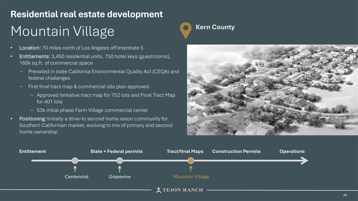 住宅房地产开发Kern County Mountain Village •位置:洛杉矶以北70英里5号州际公路外•权利:3450个住宅单元、750个酒店钥匙(客房)、16万平方英尺的商业空间−适用于加利福尼亚州环境质量法案(CEQA)和联邦挑战−第一个最终地块地图和商业场地计划获得批准−批准752个地块的暂定地块地图和401个地块的最终地块地图− 53k初始阶段Farm Village商业中心•定位:最初是南加州市场的一个免下车的第二家度假社区,演变为一次和第二次住房所有权权利的混合状态+联邦许可区域/最终地图施工许可运营山村26