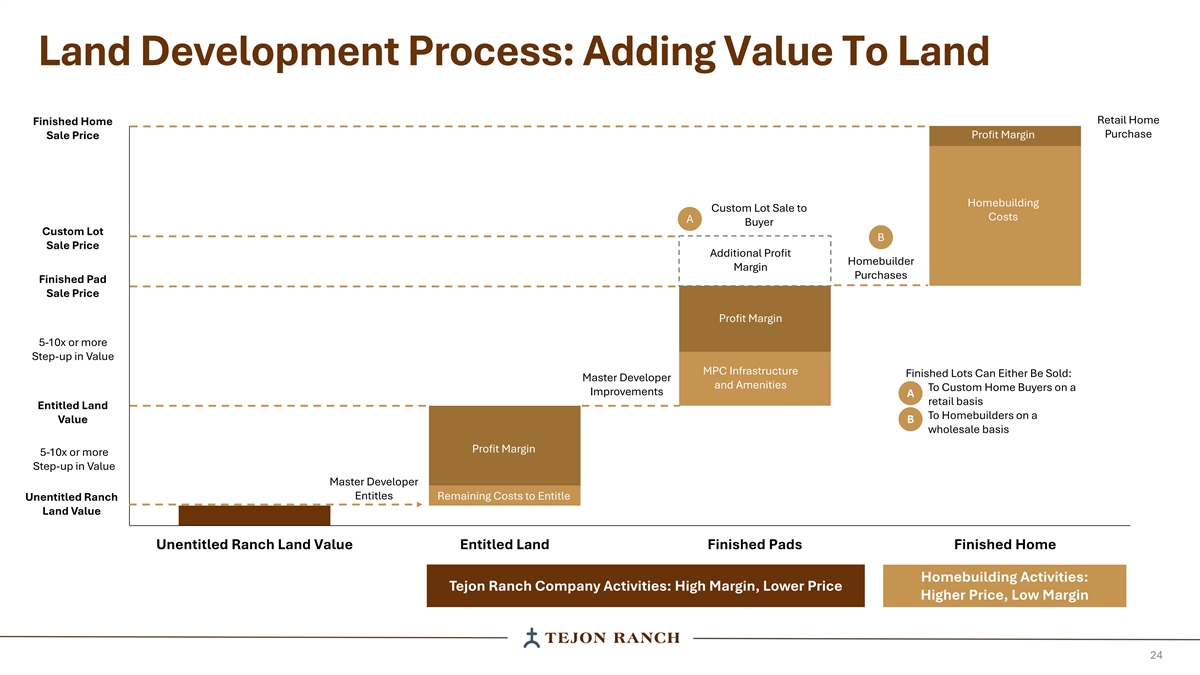 土地开发流程:增值土地零售房屋成品购买利润率销售价格房屋建筑定制地块销售成本买方定制地块B销售价格额外利润房屋建筑商保证金购买成品垫销售价格利润率5-10倍或更多价值升级MPC基础设施成品地块可以出售:总开发商和便利设施A.在改善型零售基础上定制有权土地的购房者B.在价值B批发基础上定制有权土地的房屋建筑商利润率5-10倍或更多价值提升主开发商有权剩余成本有权无权牧场土地价值无权牧场土地价值有权土地成品垫成品房屋建造活动:Tejon牧业公司活动:高利润率、低价格高价格、低利润率24