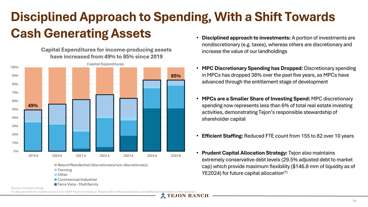 有纪律的支出方式,转向产生现金的资产•有纪律的投资方式:一部分投资是非可自由支配的(例如税收),而其他投资是可自由支配的,增加了我们持有的土地的价值• MPC可自由支配的支出下降:过去五年来,MPC的可自由支配支出下降了38%,因为MPC已经通过了发展的权利阶段• MPC在投资支出中所占份额较小:MPC可自由支配的支出现在占房地产投资活动总额的比例不到6%,展示Tejon对股东资本的负责任管理•高效的人员配置:在10年内将FTE数量从155个减少到82个•审慎的资本配置策略:Tejon还保持极其保守的债务水平(29.5%的调整后债务与市值之比),这为未来的资本配置提供了最大的灵活性(截至(1)YE2024的流动性为146.8毫米)资料来源:公司文件。(1)调整后的债务市值是一种非公认会计准则财务指标。请参阅附录中的和解和附加信息.。31