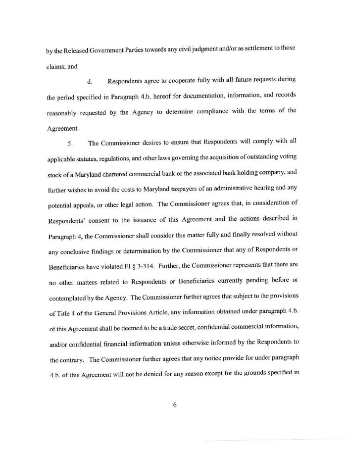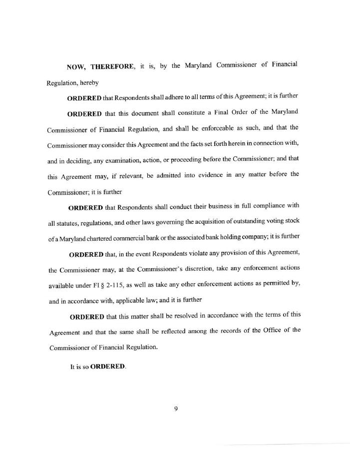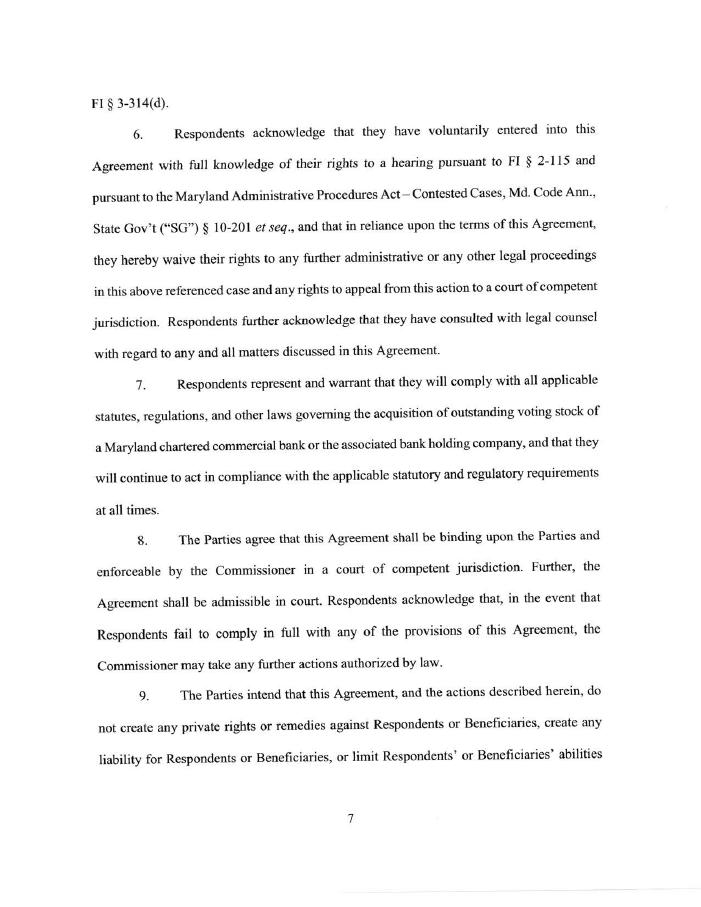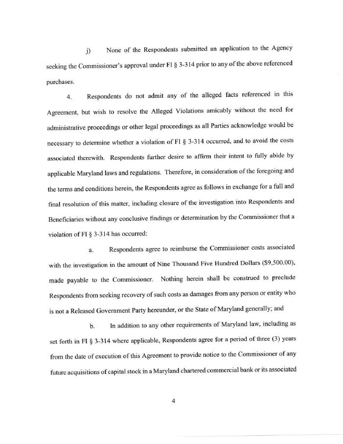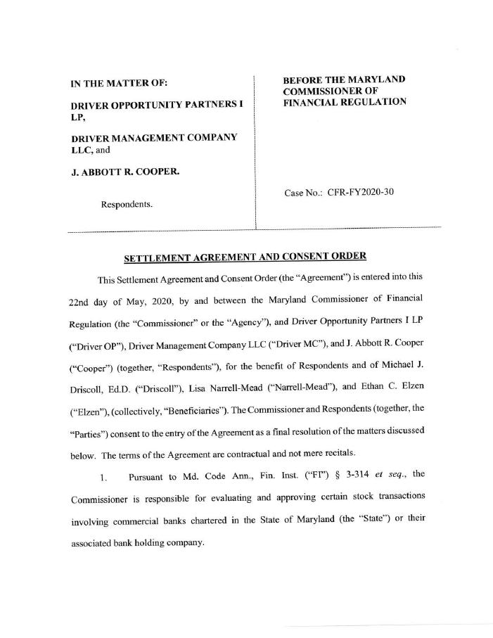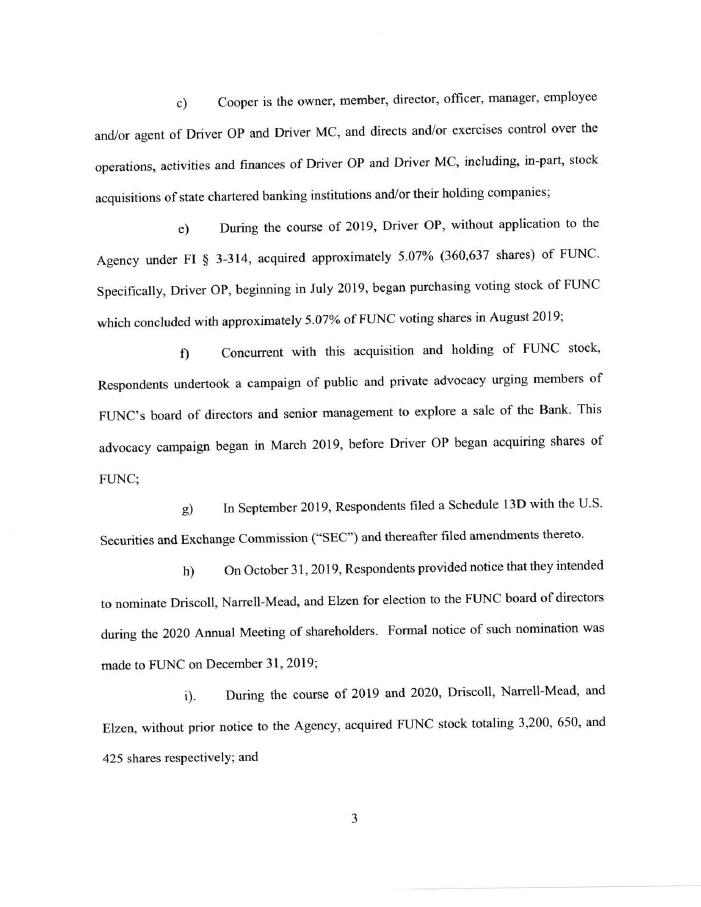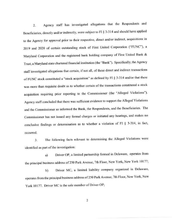 如你所知,2020年1月21日,财务条例专员办公室执行小组开始调查驾驶员机会合伙人、LP和某些其他个人(统称"驾驶员" )收购拥有第一联合银行和马里兰州奥克兰信托银行(一家马里兰州特许银行机构)的第一联合公司( "公司" )投票权股份的百分之五(5% )以上。公司和银行受我办公室的监督。安代码翅膀督察( "FI" )标题3和5。调查已经完成,工作人员得出结论认为,有足够的证据证明,司机未能事先申请批准所提到的股票购买违反了马里兰州FI3-314附加说明的规定。鉴于在这一案件中似乎发生了违法行为,我正在与马里兰州总检察长办公室的律师协商,以确定在FI2-115和2-116下,如果有的话,我们办公室将采取哪些适当的下一步措施。