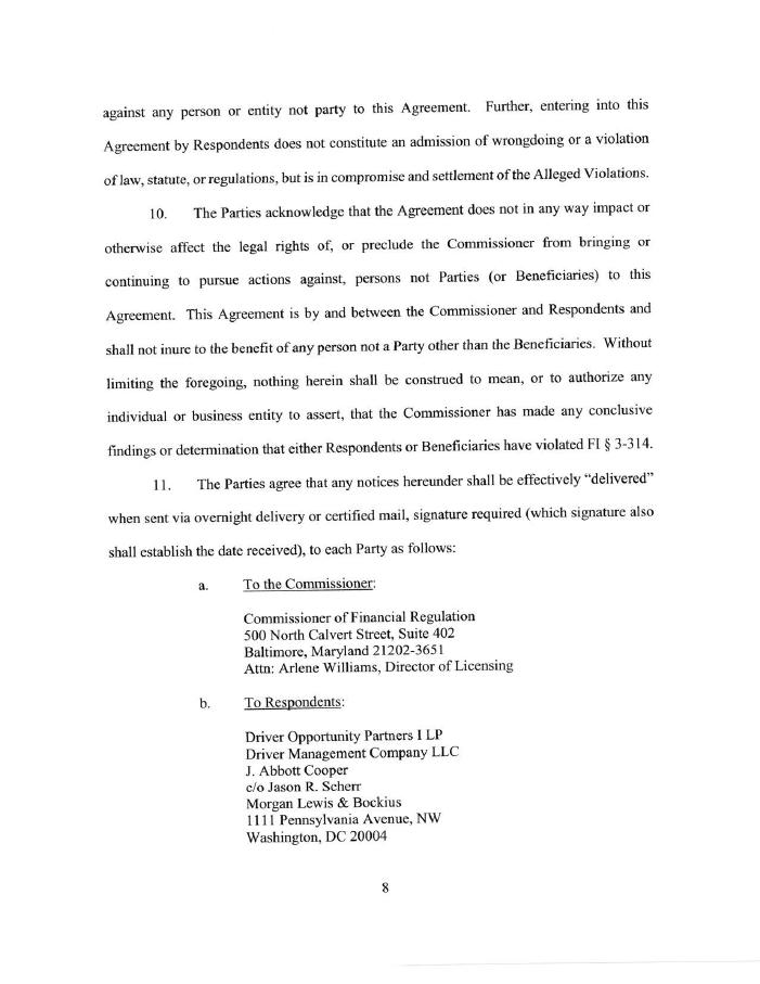 司机与马里兰州专员达成的和解协议没有解决司机违反股票收购法规是否禁止其在五年内,包括在即将举行的年度会议上投票的问题。它也没有解决司机提名是否根据第一曼联的章程或马里兰州法律有效的问题。上周,我们要求马里兰州法院宣布救济,以澄清这两个问题,司机威胁要起诉我们。我们将继续寻求这一决心,以便为我们的股东提供所需的清晰度。