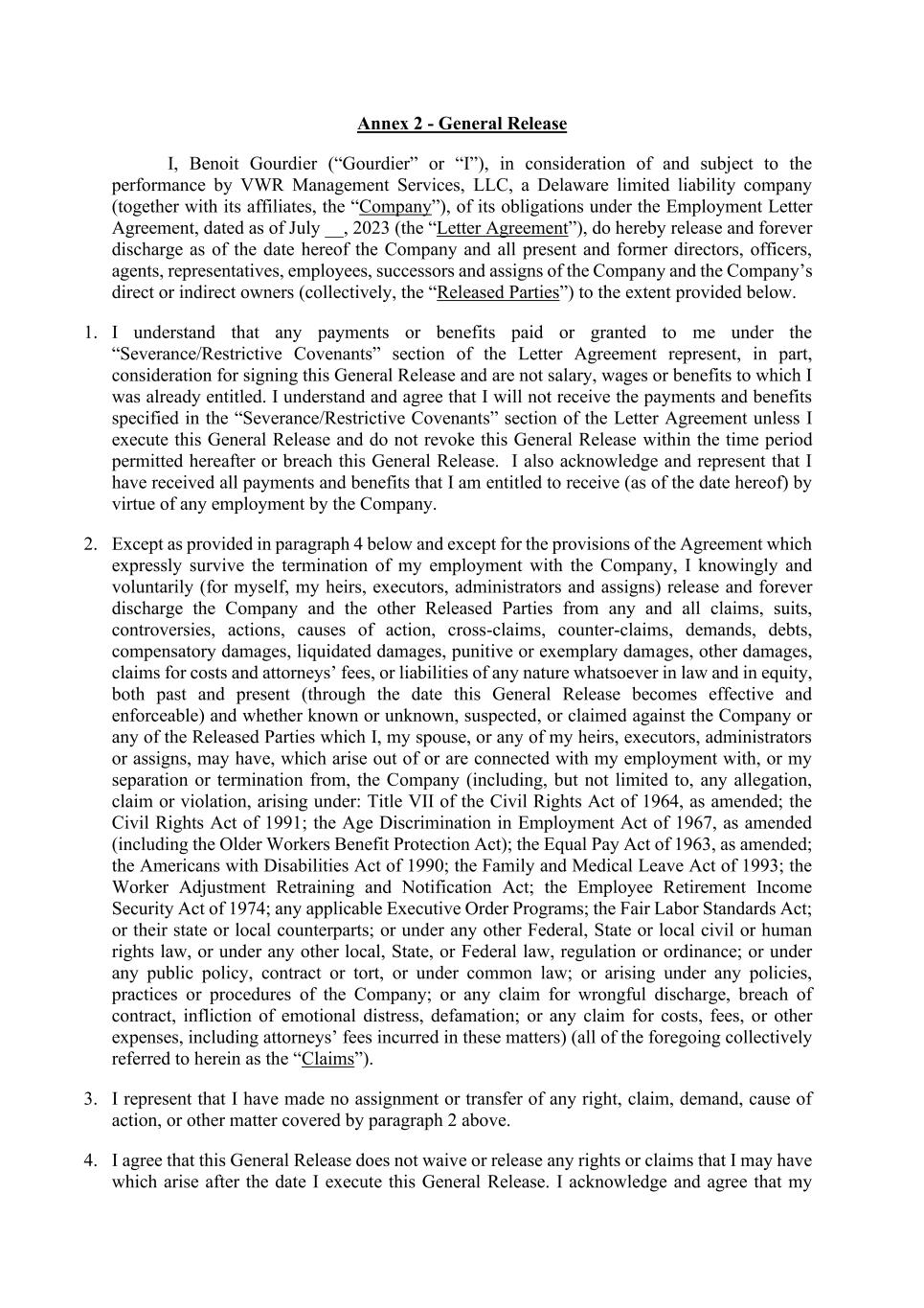 附件2-General Release I,Benoit Gourdier(“Gourdier”或“I”),考虑到并受制于VWR Management Services,LLC,一家特拉华州有限责任公司(连同其关联公司,“公司”)履行其在截至2023年7月__的雇佣信函协议(“信函协议”)下的义务,特此解除并永久解除截至本协议日期公司以及公司所有现任和前任董事、高级职员、代理人、代表、雇员、继任者和受让人以及公司的直接或间接所有者(统称“被解约方”)在以下规定的范围内。1.我理解,根据信函协议的“遣散费/限制性契约”部分向我支付或授予的任何付款或福利部分代表签署本一般公告的对价,而不是我已有权获得的工资、工资或福利。本人理解并同意,除非本人执行本一般释放且不在下文允许的期限内撤销本一般释放或违反本一般释放,否则本人将不会获得信函协议“遣散费/限制性契约”部分规定的付款和利益。本人亦确认并声明,本人已收到(截至本协议日期)因公司受雇而有权获得的所有付款和福利。2.除下文第4段规定和协议中明确在我与公司的雇佣关系终止后仍然有效的条款外,本人(为本人、我的继承人、遗嘱执行人、管理人和受让人)在知情的情况下自愿解除并永久解除公司和其他解除权利方的任何和所有索赔、诉讼、争议、诉讼、诉讼因由、交叉索赔、反索赔、要求、债务、补偿性损害赔偿、违约金、惩罚性或惩戒性损害赔偿、其他损害赔偿、费用和律师费索赔,或法律和衡平法上任何性质的责任,过去和现在(截至本一般免责声明生效和可强制执行之日)以及本人、我的配偶或我的任何继承人、遗嘱执行人、管理人或受让人可能对公司或任何已获解除的当事人提出的已知或未知、怀疑或索赔,这些索赔产生于或与我受雇于公司或与我的离职或终止于公司有关(包括但不限于根据以下情况产生的任何指控、索赔或违反:1964年《民权法案》第七章,经修订的;1991年《民权法案》;经修订的1967年《就业年龄歧视法案》(包括《老年工人福利保护法》);经修订的1963年《同工同酬法》;1990年《美国残疾人法案》;1993年《家庭和病假法案》;《工人调整再培训和通知法》;1974年《雇员退休收入保障法》;任何适用的行政命令计划;《公平劳动标准法》;或其州或地方对应方;或根据任何其他联邦、州或地方民事或人权法律,或根据任何其他地方、州、或联邦法律、法规或条例;或根据任何公共政策、合同或侵权行为,或根据普通法;或根据公司的任何政策、做法或程序产生;或任何关于错误解除义务、违约、造成情绪困扰、诽谤的索赔;或任何关于成本、费用或其他费用的索赔,包括在这些事项中产生的律师费)(所有上述情况在此统称为“索赔”)。3.本人声明,本人并无就任何权利、要求、要求、诉讼因由或上述第2款所涵盖的其他事项作出转让或转移。4.本人同意,本一般发布不放弃或解除本人在执行本一般发布之日后可能拥有的任何权利或主张。我承认并同意我的