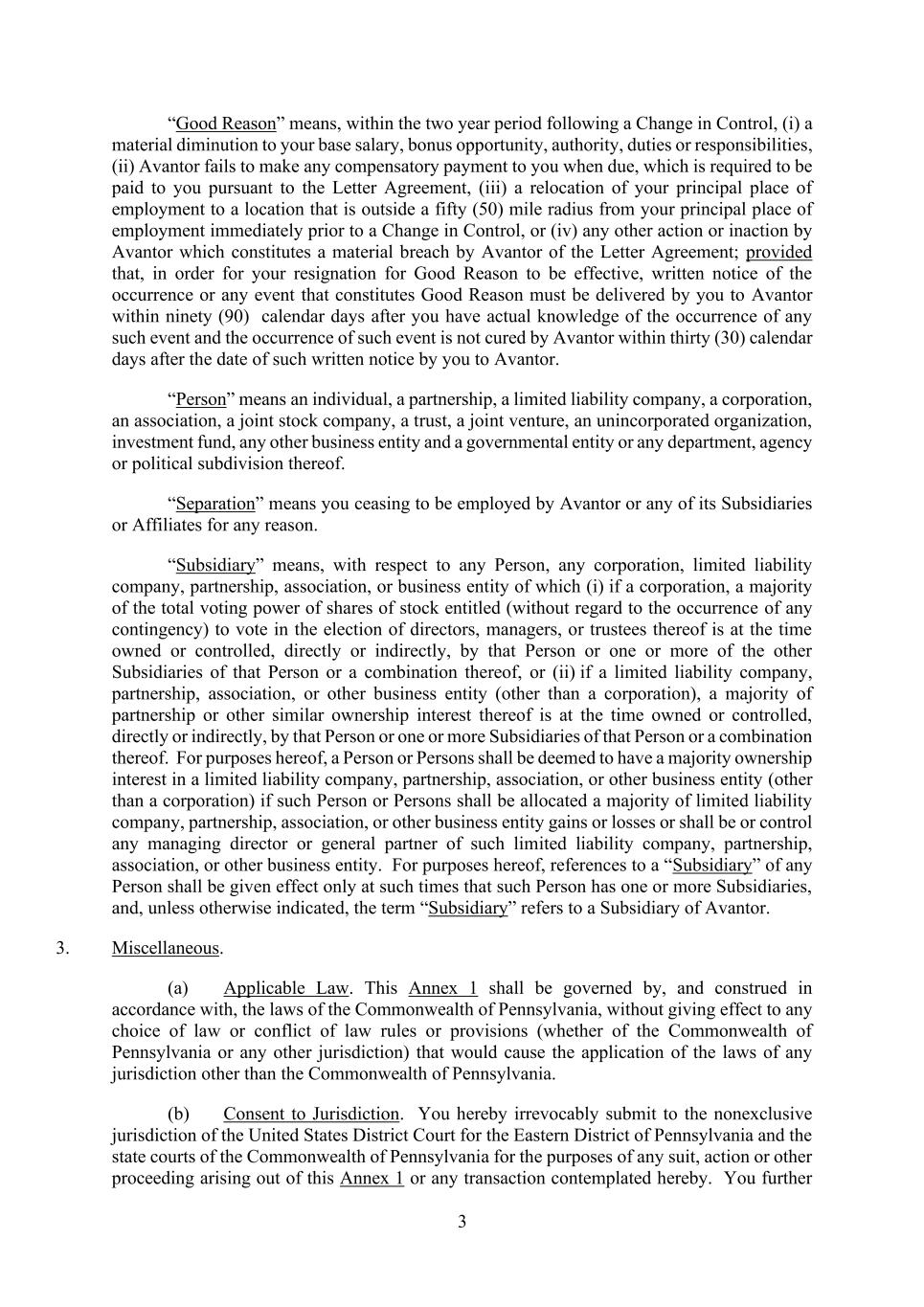 3“正当理由”指,在控制权变更后的两年期间内,(i)您的基本工资、奖金机会、权力、职责或责任大幅减少,(ii)Avantor未能在到期时向您支付任何补偿金,该补偿金是根据信函协议规定向您支付的,(iii)您的主要工作地点搬迁至紧接控制权变更前距离您的主要工作地点方圆五十(50)英里以外的地点,(iv)(iv)Avantor的任何其他作为或不作为,构成Avantor对信函协议的重大违反;但若要使您的正当理由辞职生效,您必须在您实际知悉任何该等事件的发生且该等事件的发生未由Avantor在您向Avantor发出该等书面通知之日起三十(30)个日历日内将该等事件的发生或任何构成正当理由的事件的书面通知送达Avantor。“人”是指个人、合伙企业、有限责任公司、公司、协会、股份有限公司、信托、合营企业、非法人组织、投资基金、任何其他经营实体和政府实体或其任何部门、机构或政治分支机构。“离职”是指您因任何原因不再受雇于Avantor或其任何子公司或关联公司。“附属公司”是指,就任何人而言,任何公司、有限责任公司、合伙企业、协会或商业实体,其中(i)如果一家公司,在选举董事、经理或其受托人时有权(不考虑任何或有事项的发生)投票的股份的总投票权的多数在当时由该人或该人的一个或多个其他子公司或其组合直接或间接拥有或控制,或(ii)如果一家有限责任公司、合伙企业、协会,或其他商业实体(公司除外),其多数合伙企业或其他类似所有权权益在当时由该人或该人的一个或多个子公司或其组合直接或间接拥有或控制。就本协议而言,一人或多人在有限责任公司、合伙企业、协会或其他商业实体(公司除外)中拥有多数所有权权益,如果该人或多人应被分配有限责任公司、合伙企业、协会或其他商业实体的多数收益或损失,或应是或控制该有限责任公司、合伙企业、协会或其他商业实体的任何董事总经理或普通合伙人。就本协议而言,对任何人的“子公司”的提及仅在该人拥有一个或多个子公司时才生效,除非另有说明,否则“子公司”一词是指Avantor的子公司。3.杂项。(a)适用法律。本附件1应受宾夕法尼亚州联邦法律管辖并按其解释,但不实施任何法律选择或法律冲突规则或规定(无论是宾夕法尼亚州联邦或任何其他司法管辖区的规则或规定),这些规则或规定会导致适用宾夕法尼亚州联邦以外的任何司法管辖区的法律。(b)同意管辖。就本附件1引起的任何诉讼、诉讼或其他程序或在此设想的任何交易而言,贵公司在此不可撤销地服从美国宾夕法尼亚州东区地区法院和宾夕法尼亚州联邦地区法院的非专属管辖权。你进一步