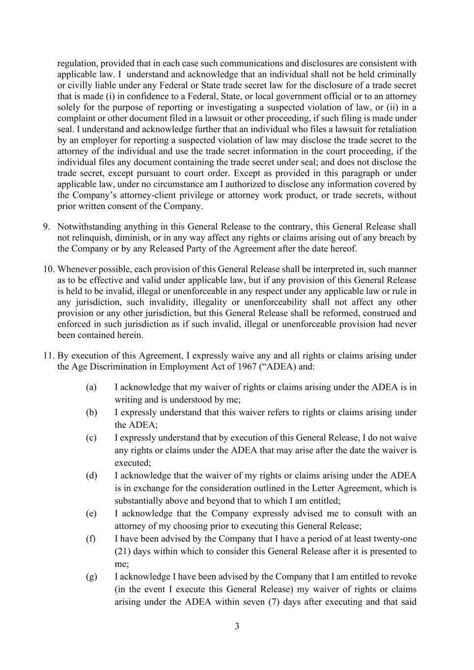 3条规定,前提是在每种情况下,此类通信和披露均符合适用法律。本人理解并承认,个人不应因(i)仅为报告或调查涉嫌违法行为而向联邦、州或地方政府官员或向律师秘密披露商业秘密,或(ii)在诉讼或其他程序中提交的投诉或其他文件中披露商业秘密而根据任何联邦或州商业秘密法承担刑事或民事责任,如果此类提交是盖章提交的。本人理解并进一步承认,个人因举报涉嫌违法行为而提起雇主报复诉讼的,可以向个人的代理律师披露商业秘密,并在法院诉讼程序中使用商业秘密信息,如果个人将任何包含商业秘密的文件盖章归档;并且不披露商业秘密,除非依据法院命令。除本款规定或适用法律规定外,在任何情况下,未经公司事先书面同意,本人均无权披露公司的律师-委托人特权或律师工作产品或商业秘密所涵盖的任何信息。9.尽管本一般发布中有任何相反的规定,本一般发布不应放弃、减少或以任何方式影响在本协议日期之后因公司或任何已解除协议的一方的任何违约行为而产生的任何权利或索赔。10.凡有可能,本通则的每项规定均应按适用法律规定的有效和有效方式加以解释,但如本通则的任何规定根据任何司法管辖区的任何适用法律或规则被裁定在任何方面无效、非法或不可执行,则该等无效、非法或不可执行不应影响任何其他规定或任何其他司法管辖区,但本通则应在该司法管辖区进行改革、解释和执行,如同该无效、非法或不可执行的规定从未载于本通则。11.通过执行本协议,本人明确放弃根据1967年《就业年龄歧视法案》(“ADEA”)产生的任何和所有权利或主张,并且:(a)我承认我对根据ADEA产生的权利或主张的放弃是书面的,并且得到我的理解;(b)我明确理解本放弃是指根据ADEA产生的权利或主张;(c)我明确理解通过执行本一般发布,本人不放弃在豁免执行日期后可能产生的ADEA项下的任何权利或债权;(d)本人承认放弃本人在ADEA项下产生的权利或债权是为了换取信函协议中概述的对价,这大大超出了我有权获得的权利;(e)我承认公司明确建议我在执行本一般发布前咨询我选择的律师;(f)我已获公司告知,在向我提出本一般发布后,我有至少二十一(21)天的时间考虑本一般发布;(g)我承认我已获公司告知我有权在执行后七(7)天内撤销(如果我执行本一般发布)我对根据ADEA产生的权利或索赔的放弃,并且说