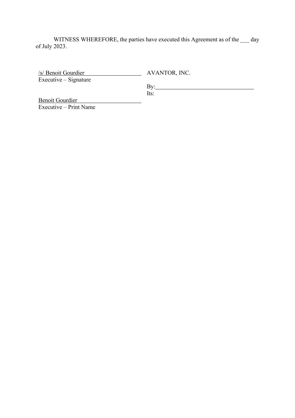 在此作证,双方已于2023年7月___日签署本协议。/s/Benoit Gourdier Executive – Signature Avantor,INC。Benoit Gourdier Executive – Print Name by:its: