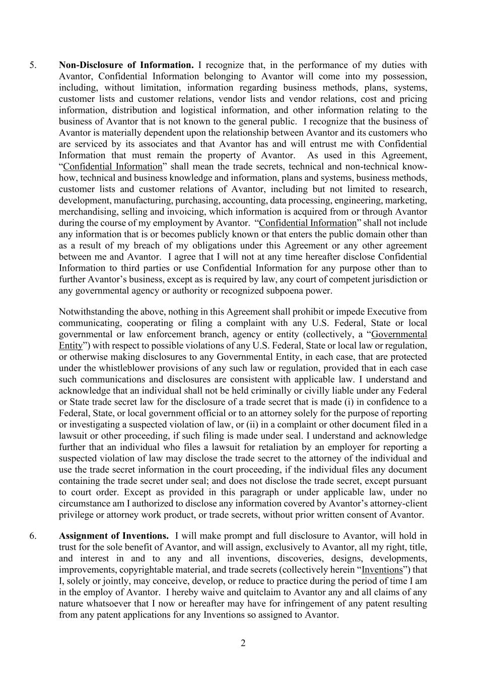 2 5.不披露信息。本人承认,在履行与Avantor的职责过程中,本人将拥有属于Avantor的机密信息,包括但不限于有关业务方法、计划、系统、客户名单和客户关系、供应商名单和供应商关系、成本和价格信息、分销和后勤信息,以及与Avantor的业务有关的其他不为公众所知的信息。我承认,Avantor的业务在很大程度上依赖于Avantor与其由其联营公司提供服务的客户之间的关系,并且Avantor拥有并将委托我提供机密信息,而这些信息必须仍然是TERM3的财产。本协议所称“机密信息”是指Avantor的商业秘密、技术和非技术诀窍、技术和业务知识和信息、计划和制度、业务方法、客户名单和客户关系,包括但不限于研究、开发、制造、采购、会计、数据处理、工程、营销、销售、销售和开具发票等方面的信息,这些信息是在本人受雇于Avantor期间从或通过Avantor获得的。“机密信息”不应包括除因本人违反本协议或本人与Avantor之间任何其他协议项下义务而导致的已为或已为公众所知的或进入公共领域的任何信息。本人同意,除法律、任何有管辖权的法院或任何政府机构或当局或经认可的传票权另有规定外,本人在此后的任何时间均不会向第三方披露机密信息或将机密信息用于除推进Avantor业务以外的任何目的。尽管有上述规定,本协议中的任何规定均不得禁止或阻碍行政部门就可能违反任何美国联邦、州或地方政府或执法部门、机构或实体(统称为“政府实体”)就可能违反任何美国联邦、州或地方法律或法规的行为进行沟通、合作或提出投诉,或以其他方式向任何政府实体进行披露,在每种情况下均受任何此类法律或法规的举报人条款保护,前提是在每种情况下此类沟通和披露均符合适用法律。本人理解并承认,个人不应因(i)仅为报告或调查涉嫌违法行为而向联邦、州或地方政府官员或向律师秘密披露的商业秘密,或(ii)在诉讼或其他程序中提交的投诉或其他文件中披露的商业秘密而根据任何联邦或州商业秘密法承担刑事或民事责任,如果此类提交是密封的。本人进一步理解并承认,个人因举报涉嫌违法行为而提起雇主报复诉讼的,可以向个人的代理律师披露商业秘密,并在法院诉讼程序中使用商业秘密信息,个人对含有商业秘密的任何文件进行盖章备案的;不泄露商业秘密的,依照法院命令的除外。除本款规定或适用法律另有规定外,在任何情况下,未经Avantor事先书面同意,本人均无权披露Avantor的律师-委托人特权或律师工作产品所涵盖的任何信息,或商业秘密。6.转让发明。本人将及时、充分地向Avantor披露,将以信托方式为Avantor的唯一利益而持有,并将独家地向Avantor转让本人对任何和所有发明、发现、设计、开发、改进、版权材料和商业秘密(统称“发明”)的所有权利、所有权、权益,以及在本人受雇于TERM3期间,本人单独或共同可能构思、开发或沦为实践的所有发明、发现、设计、开发或商业秘密(在此统称“发明”)的所有权利、所有权、权益。对于因如此转让给Avantor的任何发明的任何专利申请而导致的侵犯任何专利的行为,本人特此放弃并放弃向Avantor提出的任何及所有任何性质的权利要求,无论我现在或以后可能提出。