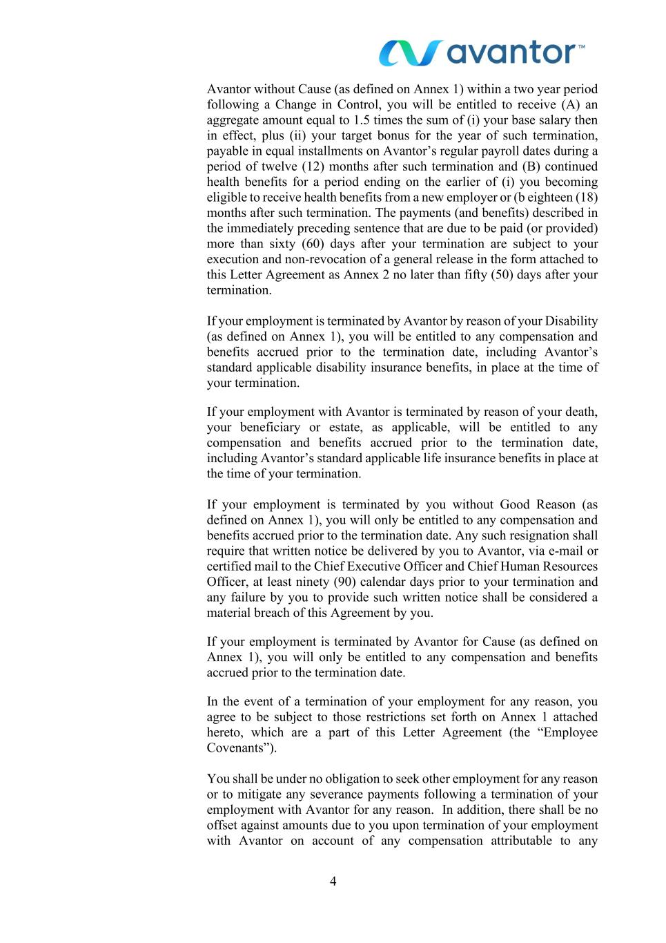 4 Avantor(定义见附件1)在控制权变更后的两年内无故(a),您将有权获得(a)总额等于(i)您当时有效的基本工资之和的1.5倍,加上(ii)您在该终止年度的目标奖金,在此种终止后的十二(12)个月期间内,在Avantor的正常发薪日期等额分期支付,以及(b)在(i)您有资格从新雇主处领取健康福利或(b)此种终止后的十八(18)个月中较早者结束的期间内的持续健康福利。前一句所述在你方终止后六十(60)天以上应予支付(或提供)的付款(及利益),须由你方最迟于你方终止后五十(50)天内以本函件协议附件2所附表格执行及不撤销一般释放。如果您的雇佣关系因您的残疾(定义见附件1)而被Avantor终止,您将有权获得在终止日期之前应计的任何补偿和福利,包括您终止时到位的Avantor标准适用的残疾保险福利。如果您因死亡而终止与Avantor的雇佣关系,您的受益人或遗产(如适用)将有权获得在终止日期之前应计的任何补偿和福利,包括您终止时到位的Avantor标准适用人寿保险福利。如果您的雇佣被您无正当理由(定义见附件1)终止,您将仅有权获得在终止日期之前累积的任何补偿和福利。任何此类辞职应要求由您在终止合同至少九十(90)个日历日前向首席执行官和首席人力资源官送达书面通知Avantor、通过电子邮件或挂号信方式,并且您未能提供此类书面通知将被视为您对本协议的重大违反。若您的雇佣关系被Avantor(定义见附件1)因故终止,您将仅有权获得在终止日期之前应计的任何补偿和福利。如因任何原因终止你的雇佣关系,你同意受制于附件1所载的限制,这些限制是本信函协议的一部分(“雇员契约”)。在您因任何原因终止与Avantor的雇佣关系后,您没有义务以任何理由寻求其他工作或减轻任何遣散费。此外,不得因应占任何补偿而抵销于您终止与Avantor的雇佣时应付予您的款项