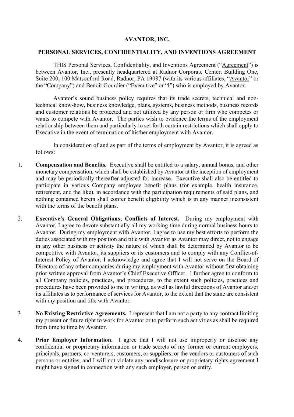 Avantor, Inc.个人服务、保密性和发明协议本个人服务、保密性和发明协议(“协议”)是由目前总部位于Radnor Corporate Center,Building One,Suite 200,100 Matsonford Road,Radnor,PA 19087(与其各种关联公司,“Avantor”或“公司”)的Avantor, Inc.与受雇于Avantor的Benoit Gourdier(“主管”或“I”)之间签订的。Avantor健全的商业政策要求其商业秘密、技术和非技术诀窍、商业知识、计划、系统、商业方法、商业记录和客户关系受到保护,并且不被任何与Avantor竞争或想要竞争的个人或公司利用。双方希望证明他们之间雇佣关系的条款,特别是提出某些限制,这些限制将适用于在终止与Avantor的雇佣关系的情况下执行人员。考虑到并作为Avantor雇用条款的一部分,现商定如下:1。补偿和福利。高管有权获得工资、年度奖金和其他货币报酬,这些报酬由Avantor在受雇开始时确定,此后可定期调整增加。执行人员还应有权根据上述计划的参与要求参加各种公司雇员福利计划(例如,健康保险、退休等),并且此处所载的任何内容均不得授予与福利计划条款有任何不一致的福利资格。2.高管的一般义务;利益冲突。在受雇于Avantor期间,本人同意在正常营业时间内将基本上所有的工作时间都投入到Avantor上。在任职于Avantor期间,本人同意按照Avantor所指示,尽最大努力履行与本人在Avantor所担任的职务和职务相关的职责,不从事任何其他性质被Avantor确定为与Avantor、其供应商或其客户具有竞争性的业务或活动,并遵守Avantor的任何利益冲突政策。本人确认并同意,在未事先获得Avantor首席执行官的书面批准的情况下,在我受雇于Avantor期间,我将不会在任何其他公司的董事会任职。本人进一步同意,在已向本人提供书面形式的此类政策、惯例和程序,以及Avantor和/或其关联公司关于为Avantor提供服务的合法指示的范围内,在符合本人在Avantor的职位和头衔的范围内,遵守公司的所有政策、惯例和程序。3.没有现有的限制性协议。本人谨声明,我不是任何限制我现在或将来为Avantor工作的权利或执行Avantor不时要求的活动的合同的一方。4.先前的雇主信息。本人同意,我不会不当使用或披露我的前任或现任雇主、负责人、合伙人、合营者、客户或供应商,或这些个人或实体的供应商或客户的任何机密或专有信息或商业秘密,并且我不会违反我可能与任何此类雇主、个人或实体签署的任何保密或专有权利协议。