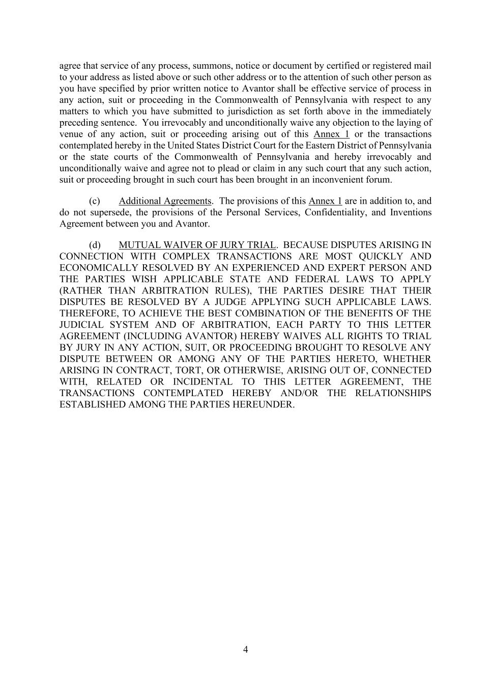 4同意以挂证或挂号邮件方式将任何程序、传票、通知或文件送达至您上述地址或其他地址,或送达您在事先书面通知Avantor中指定的其他人的注意,即为在宾夕法尼亚州联邦就您已提交上一句所述管辖的任何事项的任何诉讼、诉讼或程序中的有效程序送达。贵公司不可撤销和无条件地放弃对因本附件1引起的任何诉讼、诉讼或程序或在此拟在美国宾夕法尼亚州东区地区法院或宾夕法尼亚州联邦的州法院进行的交易的设置地点的任何异议,并在此不可撤销和无条件地放弃并同意不在任何该等法院进行辩护或主张在该法院提起的任何该等诉讼、诉讼或程序已在不方便的法院提起。(c)附加协议。本附件1的规定是对您与Avantor之间的个人服务、保密和发明协议条款的补充,但不取代该条款的规定。(d)相互放弃陪审团审判。由于与复杂交易有关的争端由经验丰富的专家以最迅速和经济的方式解决,而当事人希望适用的州和联邦法律适用(而不是仲裁规则),因此当事人希望他们的争端由适用此类适用法律的法官解决。因此,为实现司法制度和仲裁利益的最佳结合,本信函协议的每一方(包括Avantor)在此放弃在为解决此处任何一方之间或任何一方之间的任何争端而提起的任何诉讼、诉讼或程序中由陪审团审判的所有权利,无论是在合同、侵权或其他情况下产生的,