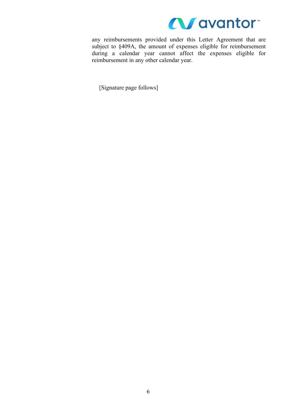 在您受雇于Avantor之后的5次就业。在符合上述通知要求的情况下,您或Avantor均可随时终止与Avantor的雇佣关系。除本遣散费/限制性契约部分的上述规定外,在您终止与Avantor的雇佣关系后,您将无权从Avantor获得任何其他工资、蚂蚁形式的补偿或福利,除非Avantor的员工福利计划中另有具体规定或适用法律另有明确要求。尽管本文有任何相反的规定,如果由于您被定性为Avantor的“特定雇员”(在财政部条例第1.409A-1(i)条的含义内),根据本协议到期的任何付款将使您根据经修订的1986年《国内税收法典》(“法典”)第409A条被征收的任何税款,则此种否则会导致此类税款的付款应在您“离职”后的第一个工作日即一百八十(180)天(在法典第409A条及其下的条例的含义内)一次性支付,及任何余下款项将根据本条前述条文支付。个人服务协议:作为与公司订立本函件协议的条件,您应签署并同意受个人服务、保密和发明协议的约束,其格式如本协议所附,作为附件 A。整个协议:本函件协议,(包括本协议所附的任何附件)以及上述提及的个人服务、保密和发明协议载列了您与Avantor之间就本协议及其标的事项的全部谅解,并取代和优先考虑贵公司与Avantor之间就本协议及其标的事项事先达成的一切口头或书面谅解和协议,该谅解和协议终止,并自本函件协议执行时起不再生效。本函件协议,以及您在本协议项下的所有权利和义务,不得由您转让或委托。你方违反前述规定所进行的任何声称的转让、转授,自发生之日起无效,不具有效力和效力。本信函协议可由Avantor转让给作为Avantor几乎所有业务运营的利益继承者的个人或实体,或转让给Avantor的子公司或关联公司。此次转让后,Avantor在本协议项下的权利和义务即成为该子公司、关联方或继承人或实体的权利和义务。守则第409A条:本信函协议将被解释为根据守则第409A条避免任何税款。就§ 409a而言,根据本信函协议支付的每笔款项将被视为单独的付款。关于