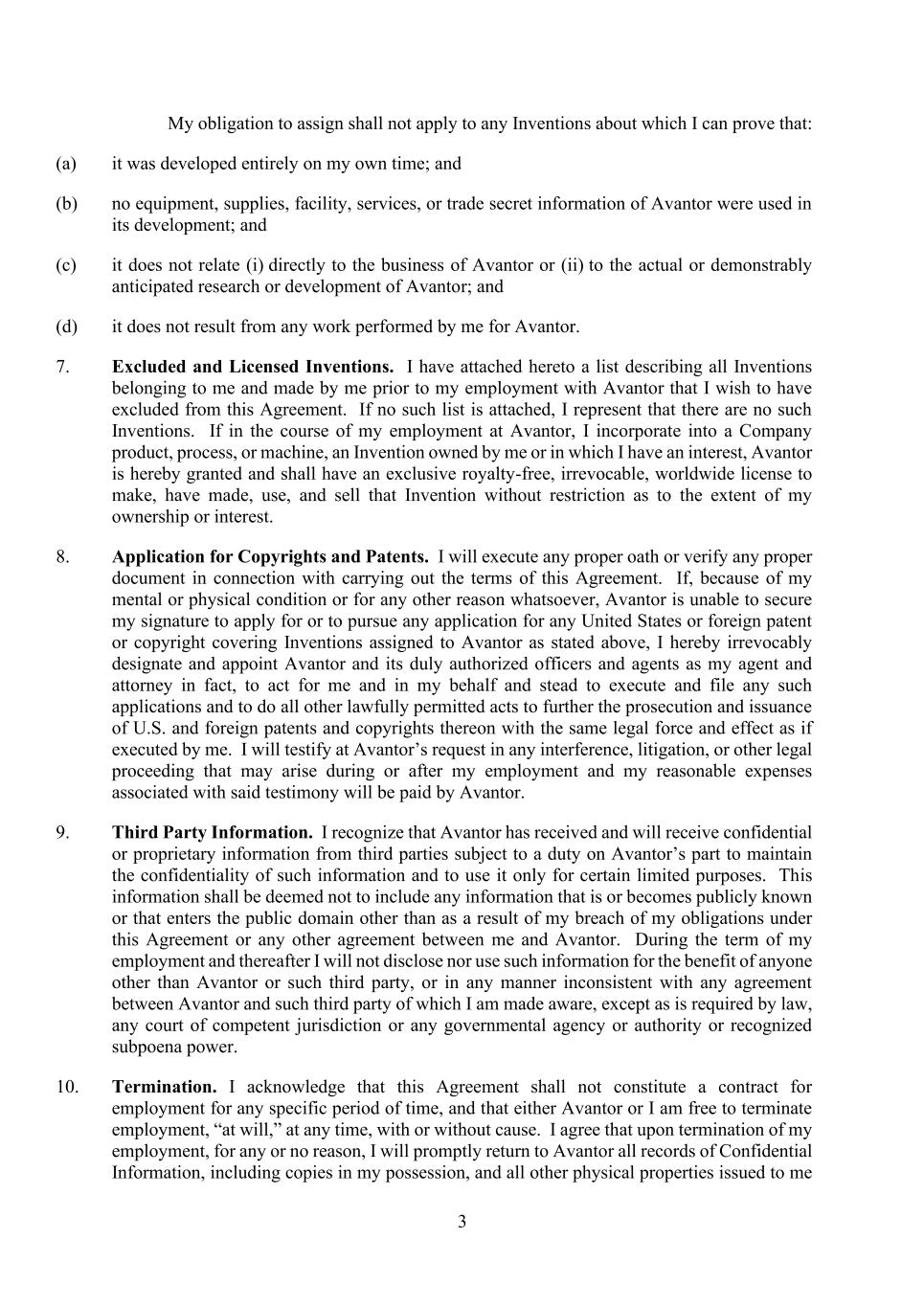 3我的转让义务不适用于我能证明的任何发明:(a)它是完全靠我自己的时间开发的;(b)在其开发过程中没有使用任何Avantor的设备、用品、设施、服务或商业秘密信息;和(c)它与(i)Avantor的业务没有直接关系,或(ii)与实际或可证明预期的Avantor的研究或开发没有直接关系;和(d)它不是由我为Avantor进行的任何工作引起的。7.排除和许可的发明。我在此附上了一份清单,其中描述了属于我的、由我在受雇于Avantor之前做出的、我希望已从本协议中排除的所有发明。如果没有附上这样的清单,我代表没有这样的发明。如果在我受雇于Avantor的过程中,我将我拥有的或我拥有权益的一项发明纳入公司的产品、工艺或机器中,Avantor特此授予并应拥有独家免版税、不可撤销的全球许可,以制造、制造、使用和销售该发明,而不受我的所有权或权益范围的限制。8.版权和专利的申请。我将执行与执行本协议条款有关的任何适当宣誓或核实任何适当文件。如果由于本人的精神或身体状况或任何其他原因,Avantor无法获得本人的签名以申请或继续就上述转让给Avantor的任何美国或外国专利或版权涵盖发明提出任何申请,本人在此不可撤销地指定并委任Avantor及其正式授权的高级职员和代理人为本人的事实上的代理人和代理人,代表本人并代为执行和提交任何此类申请,并作出所有其他合法许可的行为,以进一步起诉和颁发美国和外国专利及其版权,其法律效力和效力与由本人执行的相同。在本人受雇期间或之后可能出现的任何干预、诉讼或其他法律程序中,本人将应Avantor的要求作证,而我与该证词相关的合理费用将由Avantor支付。9.第三方信息。我承认,Avantor已经收到并将收到来自第三方的机密或专有信息,但Avantor有义务对此类信息进行保密,并仅将其用于某些有限目的。这些信息应被视为不包含除因本人违反本协议项下义务或我与Avantor之间的任何其他协议而导致的任何已为或已为公众所知的或进入公共领域的信息。在本人受雇期间及其后,除法律、任何有管辖权的法院或任何政府机构或当局或认可的传票权要求外,我不会为除Avantor或该等第三方以外的任何人的利益披露或使用该等信息,或以任何与我知悉的该等第三方之间的任何协议不一致的方式披露或使用该等信息。10.终止。本人确认,本协议不构成任何特定期限的雇佣合同,并且我或Avantor均可在任何时间、有或无理由地“随意”终止雇佣关系。我同意在终止雇佣关系时,无论出于何种原因或无任何原因,我都将及时将所有机密信息记录,包括我所拥有的副本,以及所有其他发给我的有形财产,交还给Avantor