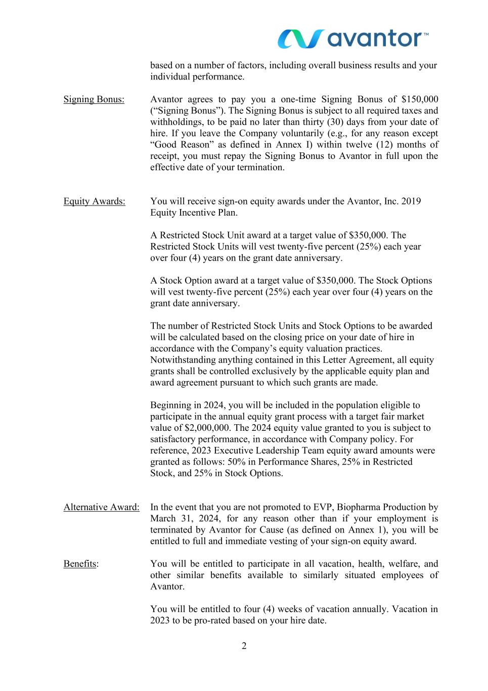 2基于多个因素,包括整体业务结果和你的个人表现。签约奖金:股权奖励:Avantor同意一次性支付给您150,000美元的签约奖金(“签约奖金”)。签约奖金须缴纳所有必要的税款和预扣税,最迟应在您受聘之日起三十(30)天内支付。如果您在收到后十二(12)个月内自愿离开公司(例如,出于除附件I中定义的“良好理由”之外的任何原因),您必须在您的终止生效之日向Avantor全额偿还签约奖金。Avantor, Inc. 2019年股权激励计划之签字股权奖励将由您领取。目标价值为35万美元的限制性股票奖励。限制性股票单位将在授予日周年日的四(4)年内每年归属25%(25%)。目标价值为35万美元的股票期权奖励。股票期权将在授予日周年日的四(4)年内每年归属25%(25%)。拟授予的限制性股票单位数量和股票期权数量将按照贵公司股权估值惯例,以贵公司聘用日的收盘价计算。尽管本信函协议中有任何规定,所有股权授予均应完全由进行此类授予所依据的适用股权计划和授予协议控制。从2024年开始,您将被包括在有资格参与年度股权授予流程的人群中,目标公平市场价值为2,000,000美元。根据公司政策,授予您的2024年股权价值取决于令人满意的业绩表现。作为参考,2023年度执行领导团队股权奖励金额授予如下:业绩股50%、限制性股票25%、股票期权25%。另类奖励:如果您在2024年3月31日之前未晋升为执行副总裁,Biopharma Production,除因事由(定义见附件1)被Avantor终止雇佣外的任何原因,您将有权获得您的签约股权奖励的全部和立即归属。福利:您将有权参加Avantor处境相似员工可获得的所有假期、健康、福利和其他类似福利。您将有权享受每年四(4)周的假期。2023年休假将根据您的聘用日期按比例分配。