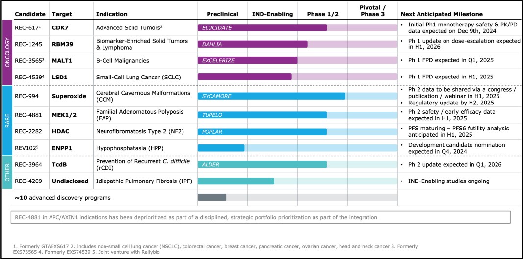 | ● | REC-4881(MEK1/2抑制剂、家族性腺瘤性息肉病):预计2025年H1的1b/2期安全性和早期疗效数据 |