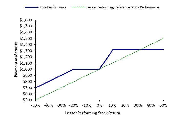 到期付款: 如果每份参考股票的最终价值大于其初始价值,您在每张1,000美元本金票据到期时的付款将按以下方式计算: $ 1,000 +($ 1,000 ×表现较差的股票回报×上行杠杆因子),以最高回报为准 如果(i)一只参考股票的最终价值高于其初始价值,而另一只参考股票的最终价值等于其初始价值或低于其初始价值最多达缓冲金额,或(ii)每只参考股票的最终价值等于其初始价值或低于其初始价值最多达缓冲金额,则您将在到期时收到您的票据的本金金额。 如果任一参考股票的最终价值低于其初始价值超过缓冲金额,您在每张1,000美元本金票据到期时的付款将按以下方式计算: $ 1,000 + [ $ 1,000 ×(表现较差的股票回报+缓冲金额)] 如果任一参考股票的最终价值低于其初始价值超过缓冲金额,您将在到期时损失部分或大部分本金。 表现较差的参考股票:表现较差的股票回报的参考股票 表现较差的股票收益率:参考股票的股票收益率较低者 股票回报率: 就每只参考股票而言, (终值–初值) 初始值:就每一参考股票而言,该参考股票的一股于定价日的收盘价,在本定价补充文件“有关参考股票的关键条款”中规定 终值:就每只参考股票而言,该参考股票的一股在观察日的收盘价 股票调整因子:对于每只参考股票,在确定该参考股票的一股收盘价时参考股票调整因子,并在定价日设置等于1.0。每只参考股票的股票调整系数可能会在发生影响该参考股票的某些公司事件时进行调整。详见随附产品补充中的“标的—参考股票—反稀释调整”和“标的—参考股票—重组事件”。