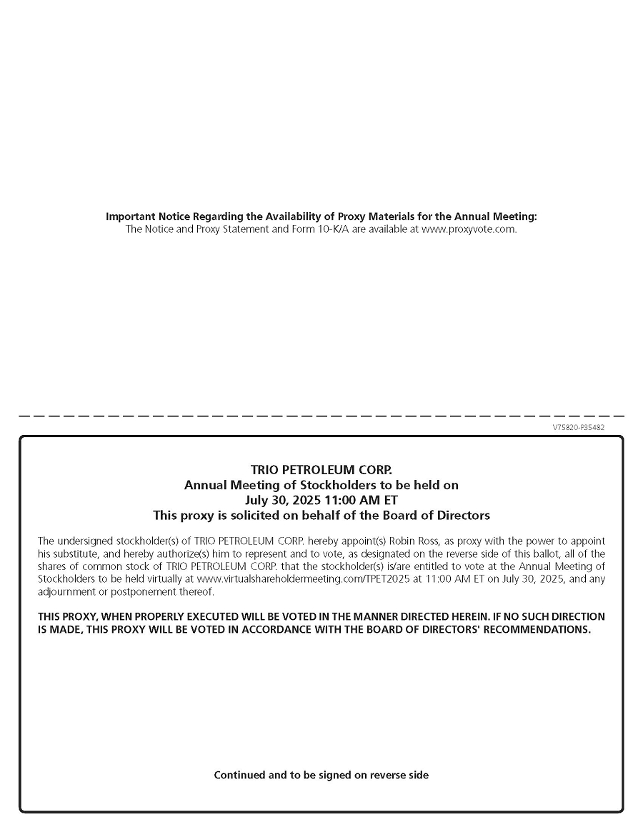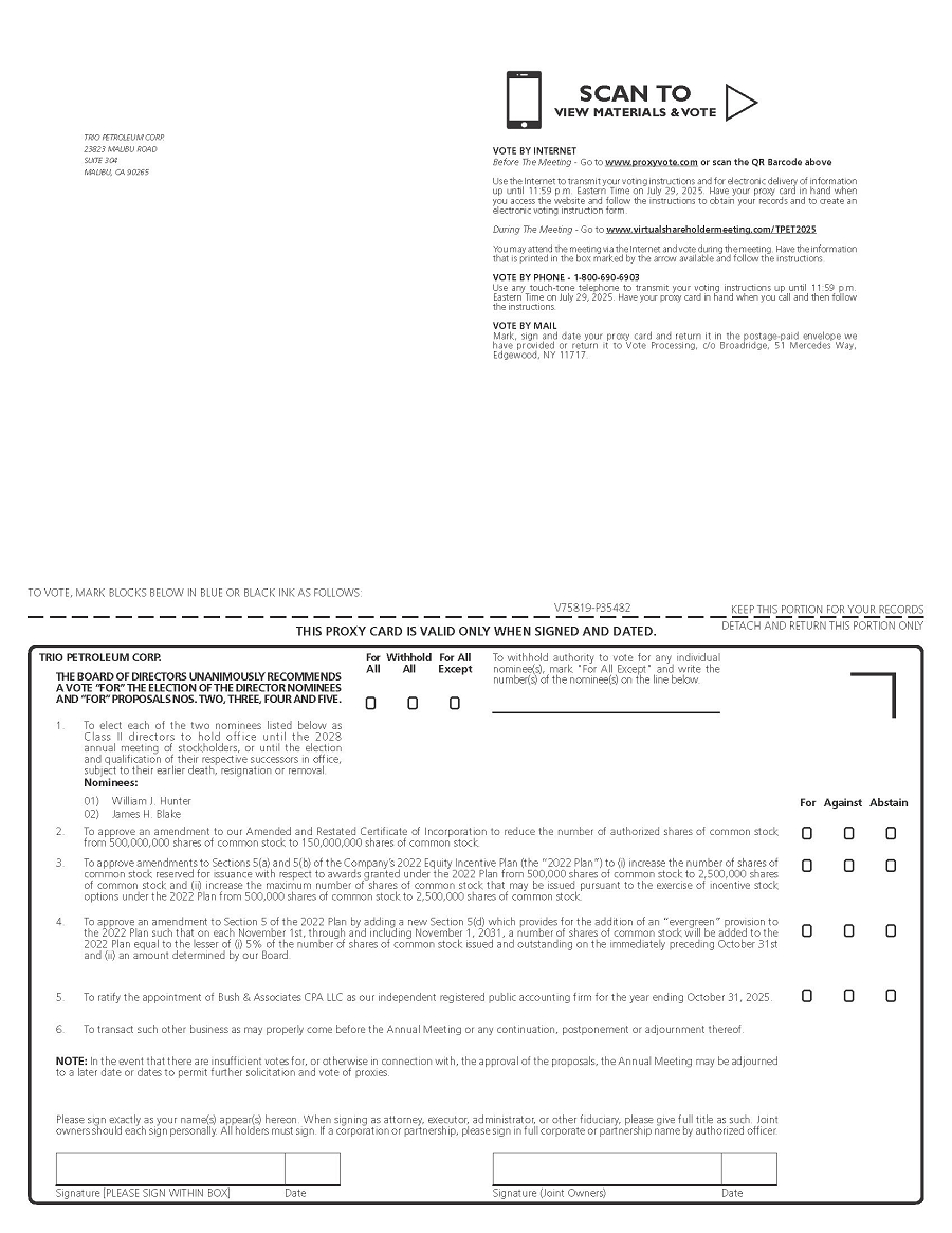 我谨代表Trio Petroleum Corp.董事会(“董事会”)诚挚邀请您参加Trio Petroleum Corp.将于美国东部时间2025年7月30日上午11:00开始以网络虚拟方式召开的2025年年度股东大会(“年度会议”)。要参加会议,您必须登录www.virtualshareholdermeeting.com/TPET2025/,并在您的代理卡或代理材料随附的说明中输入我们的代理材料互联网可用性通知中包含的16位控制号码。年度会议将为以下目的举行: