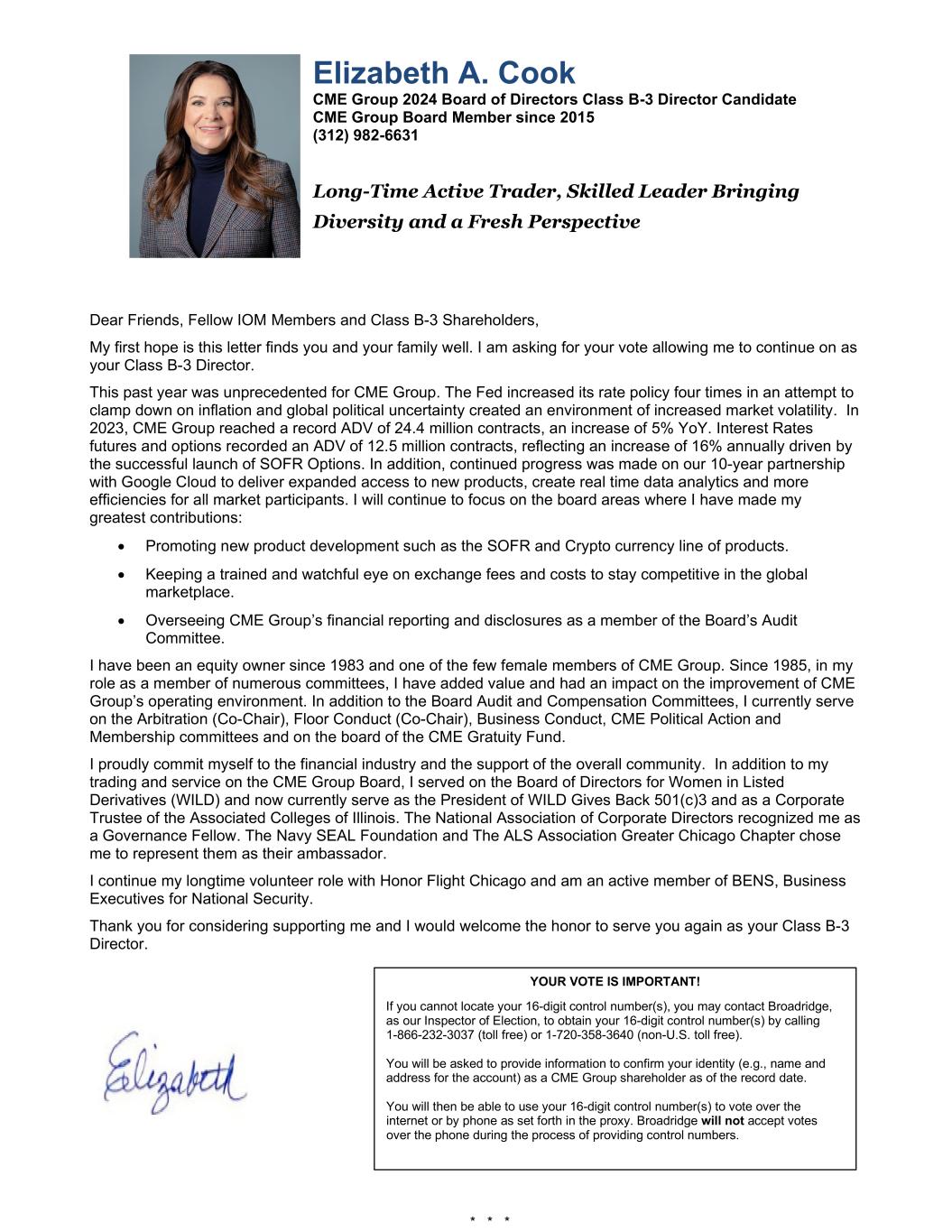 Elizabeth A. Cook芝加哥商品交易所 2024年董事会B-3类董事候选人芝加哥商品交易所董事会成员自2015年(312)982-6631长期活跃的交易员、带来多样性的熟练领导者和新鲜的视角尊敬的朋友、IOM会员和B-3类股东,我的第一个希望是这封信能找到你和你的家人。我请求您投票,允许我继续担任您的B-3类董事。过去的一年,对芝加哥商品交易所来说是前所未有的。美联储四次提高利率政策,试图抑制通胀,全球政治不确定性造成了市场波动加剧的环境。2023年,芝加哥商品交易所的ADV合约达到创纪录的2440万份,同比增长5%。利率期货和期权录得1250万份合约的ADV,反映出在SOFR期权成功推出的推动下,年化增长率为16%。此外,我们与Google Cloud的10年合作伙伴关系继续取得进展,以提供新产品的扩展访问权限,为所有市场参与者创建实时数据分析和更高的效率。我将继续专注于我做出最大贡献的板卡领域:•推动SOFR和加密货币系列产品等新产品开发。•对交易所费用和成本保持训练有素和密切关注,以保持在全球市场的竞争力。•作为董事会审计委员会成员监督芝加哥商品交易所的财务报告和披露。自1983年以来,我一直是股权所有者,也是芝加哥商品交易所为数不多的女性成员之一。自1985年以来,作为众多委员会的成员,我增加了价值,并对芝加哥商品交易所经营环境的改善产生了影响。除了董事会审计委员会和薪酬委员会,我目前还担任仲裁(联合主席)、场内行为(联合主席)、商业行为、CME政治行动和会员委员会以及CME酬金基金的董事会成员。我自豪地致力于金融业和整个社会的支持。除了在芝加哥商品交易所董事会从事交易和服务外,我还曾在上市衍生品女性组织(WILD)董事会任职,目前担任WILD Gives Back 501(c)3的总裁以及伊利诺伊州联合学院的公司受托人。全国公司董事协会认可我为治理研究员。海豹突击队基金会和ALS协会大芝加哥分会选择我代表他们担任大使。我继续担任芝加哥荣誉航班的长期志愿者角色,并且是BENS的活跃成员,BENS是国家安全部门的业务主管。感谢您考虑支持我,我很荣幸再次为您服务,担任您的B-3类总监。* * *你的投票很重要!如果您无法找到您的16位控制号码,您可以联系Broadridge,作为我们的选举检查员,通过拨打1-866-232-3037(免费电话)或1-720-358-3640(非美国免费电话)获取您的16位控制号码。您将被要求提供信息以确认您截至登记日的芝加哥商品交易所股东身份(例如账户的姓名和地址)。然后,您将能够使用您的16位数字控制号码(s)通过互联网或通过代理中规定的电话进行投票。在提供控制号码的过程中,布罗德里奇将不接受电话投票。