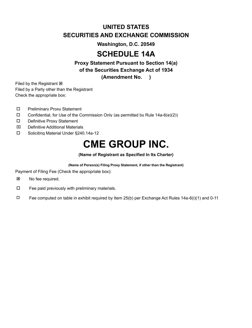 芝加哥商品交易所已就将于2024年5月9日举行的年度股东大会向美国证券交易委员会(“SEC”)提交了一份最终委托书。请芝加哥商品交易所的股东阅读最终委托书和芝加哥商品交易所 Inc.向SEC提交的任何其他相关材料,因为其中包含或将包含有关芝加哥商品交易所 Inc.和年度会议的重要信息。最终的委托书和其他相关材料(如果有),以及由芝加哥商品交易所公司向SEC提交的任何其他文件,均可在SEC网站www.sec.gov上免费获取。此外,股东可以通过联系芝加哥商品交易所公司,股东关系和会员服务部,20 South Wacker Drive,Chicago,Illinois 60606免费获得这些文件的副本。敦促股东在就年度会议上将采取行动的事项作出任何投票决定之前,阅读最终的代理声明和其他相关材料(当它们可获得时)。前面的材料是由候选人单独编写和分发的。其中所表达的观点和意见仅为候选人的观点和意见,并不一定反映芝加哥商品交易所公司或其董事、高级职员或员工的观点或意见,这些观点或意见也未经其中任何一方批准或认可。