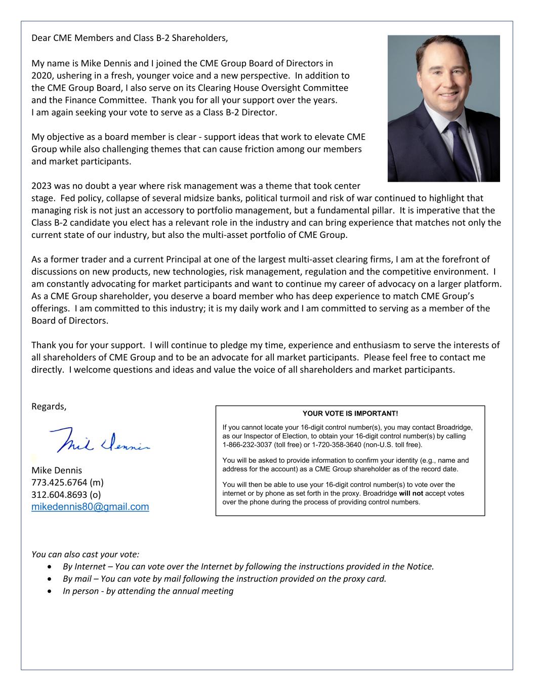 尊敬的CME成员和B-2类股东,我是Mike Dennis,我和我于2020年加入芝加哥商品交易所董事会,迎来了清新、年轻的声音和全新的视角。除了芝加哥商品交易所董事会外,我还在其清算所监督委员会和金融委员会任职。感谢大家多年来的支持。我再次寻求你的投票,以担任B-2类董事。作为董事会成员,我的目标很明确——支持那些致力于提升芝加哥商品交易所的想法,同时也要挑战那些可能在我们的成员和市场参与者之间引起摩擦的主题。2023年无疑是风险管理成为占据中心舞台的主题的一年。美联储政策、几家中型银行倒闭、政治动荡和战争风险继续凸显,管理风险不仅仅是投资组合管理的附属品,而是一个基本支柱。当务之急是,您选出的B-2类候选人在行业中具有相关作用,能够带来不仅与我们行业现状相匹配的经验,还能够带来与芝加哥商品交易所的多元资产组合相匹配的经验。作为最大的多资产清算公司之一的前交易员和现任委托人,我站在讨论新产品、新技术、风险管理、监管和竞争环境的最前沿。我一直在为市场参与者进行宣传,并希望在更大的平台上继续我的宣传生涯。作为芝加哥商品交易所的股东,您值得拥有一位具有深厚经验的董事会成员来匹配芝加哥商品交易所的产品。我致力于这个行业;这是我的日常工作,我致力于担任董事会成员。感谢您的支持。我将一如既往地以我的时间、经验和热情,为芝加哥商品交易所全体股东的利益服务,为所有市场参与者做倡导者。请随时与我直接联系。我欢迎提问和想法,重视所有股东和市场参与者的声音。您好,Mike Dennis 773.425.6764(m)312.60 4.8693(o)mikedennis80@gmail.com您也可以投票:•通过互联网–您可以按照通知中提供的说明通过互联网进行投票。•邮寄–您可以按照代理卡上提供的指示进行邮寄投票。•当面-通过参加年会你的投票很重要!如果您无法找到您的16位控制号码,您可以联系Broadridge,作为我们的选举检查员,通过拨打1-866-232-3037(免费电话)或1-720-358-3640(非美国免费电话)获取您的16位控制号码。您将被要求提供信息,以确认您截至登记日的芝加哥商品交易所股东身份(例如账户的姓名和地址)。然后,您将能够使用您的16位控制号码(s)通过互联网或通过代理中规定的电话进行投票。在提供控制号码的过程中,布罗德里奇将不接受电话投票。
