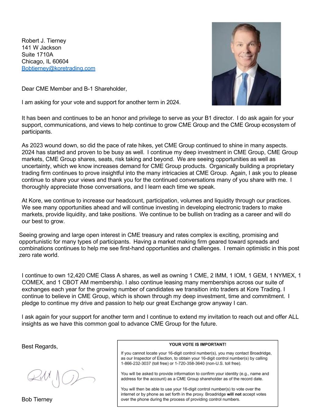 Robert J. Tierney 141 W Jackson Suite 1710A Chicago,IL 60604 Bobtierney@koretrading.com尊敬的CME成员和B-1股东,我请求您的投票和支持在2024年连任。担任你们的B1主管一直是并将继续是一种荣幸和荣幸。我再次请求您的支持、沟通和观点,以帮助继续发展芝加哥商品交易所和芝加哥商品交易所参与者生态系统。随着2023年逐渐落幕,加息步伐也随之放缓,但芝加哥商品交易所在多个方面仍持续亮眼。2024年已经开始,事实证明也很忙。我继续深入投资于芝加哥商品交易所、芝加哥商品交易所市场、芝加哥商品交易所股份、席位、风险承担乃至更远的领域。我们既看到了机会,也看到了不确定性,我们知道这会增加对芝加哥商品交易所产品的需求。有机地建立一家自营交易公司,继续证明它对芝加哥商品交易所的许多错综复杂的事物有着洞察力。再次,我请您继续分享您的观点,并感谢你们中许多人与我分享的持续对话。我非常欣赏那些谈话,每次谈话我都会学到。在Kore,我们继续通过我们的实践增加我们的员工人数、参与度、数量和流动性。我们看到了很多未来的机会,将继续投资于发展电子交易员,以做市、提供流动性和持仓。我们继续看好交易作为职业,并将尽最大努力成长。对于许多类型的参与者来说,看到CME国债和利率综合体中不断增长和大量的未平仓合约是令人兴奋的、有希望的和机会主义的。拥有一家面向价差和组合的做市公司继续帮助我看到第一手的机会和挑战。我对这个后零利率世界保持乐观。本人继续持有12,420股CME A类股票,并拥有1个CME、2个IMM、1个IOM、1个GEM、1个NYMEX、1个COMEX、1个CBOT AM会员资格。我还继续每年在我们的交易所套件中为越来越多的候选人租赁许多会员资格,我们在Kore Trading过渡到交易员。我仍然相信芝加哥商品交易所,这通过我的深度投资、时间和承诺来证明。我保证将继续我的动力和热情,尽我所能帮助我们伟大的交易所发展壮大。我再次请求您对连任的支持,并且我继续发出我的邀请,因为我们有这个共同的目标,为未来的发展推进芝加哥商品交易所,所以我们将伸出援手,提供所有的见解。最好的问候,鲍勃·蒂尔尼