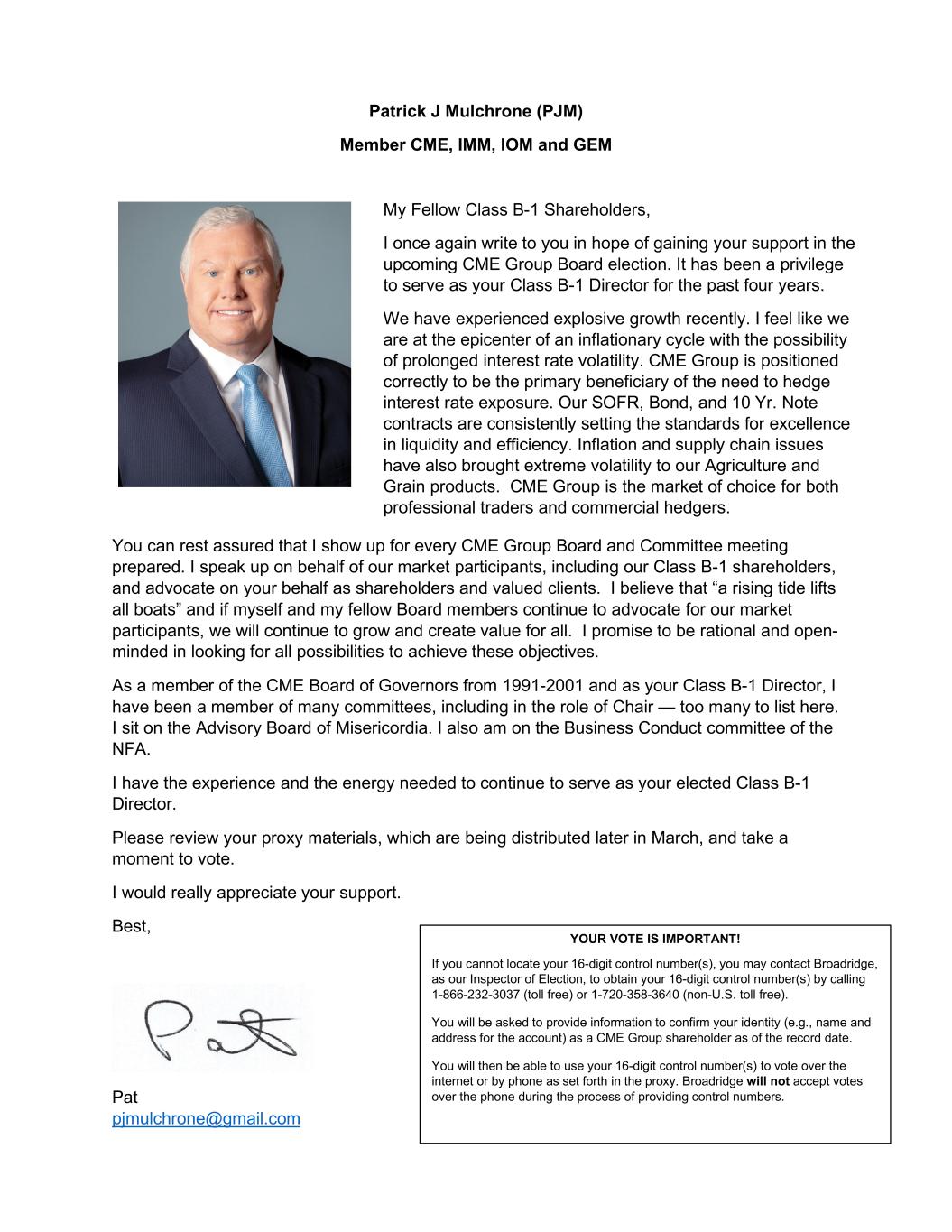 Patrick J Mulchrone(PJM)成员CME、IMM、IOM和GEM您可以放心,我会出席芝加哥商品交易所准备的每一次董事会和委员会会议。我代表我们的市场参与者,包括我们的B-1类股东发声,代表你们作为股东和尊贵的客户进行倡导。我相信“水涨船高”,如果我自己和我的董事会成员继续为我们的市场参与者鼓吹,我们将继续增长并为所有人创造价值。我承诺,在寻找实现这些目标的所有可能性时,将保持理性和开放的态度。作为1991-2001年期间CME董事会的成员以及作为贵公司的B-1类董事,我曾是许多委员会的成员,包括担任主席的角色——这里不能列举太多。我是Misericordia顾问委员会的成员。我也是NFA商业行为委员会的成员。我有继续担任你们当选的B-1级主任所需的经验和精力。请审查你们的代理材料,这些材料将于3月晚些时候分发,并花点时间进行投票。非常感谢您的支持。Best,Pat pjmulchrone@gmail.com我的B-1类股东,我再次写信给你,希望在即将到来的芝加哥商品交易所董事会选举中获得你的支持。担任你们这四年的B-1级主任,我感到很荣幸。我们最近经历了爆炸性增长。我觉得我们正处于通胀周期的中心,利率波动可能会延长。芝加哥商品交易所的定位是正确的,可以成为对冲利率风险敞口需求的主要受益者。我们的SOFR,债券,和10年。票据合约一直在为流动性和效率方面的卓越设定标准。通货膨胀和供应链问题也给我们的农业和粮食产品带来了极端的波动。无论是专业交易员还是商业套期保值者,芝加哥商品交易所都是他们的首选市场。你的投票很重要!如果您无法找到您的16位控制号码,您可以联系Broadridge,作为我们的选举检查员,通过拨打1-866-232-3037(免费电话)或1-720-358-3640(非美国免费电话)获取您的16位控制号码。您将被要求提供信息,以确认您截至登记日的芝加哥商品交易所股东身份(例如账户的姓名和地址)。然后,您将能够使用您的16位控制号码(s)通过互联网或通过代理中规定的电话进行投票。在提供控制号码的过程中,布罗德里奇将不接受电话投票。