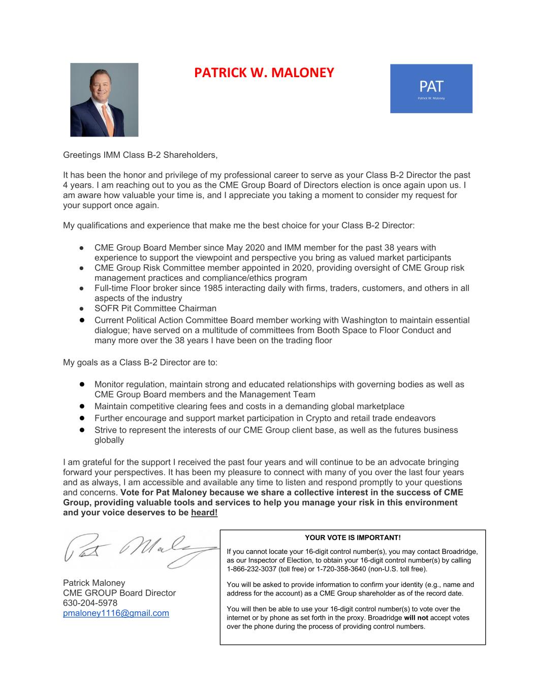 Patrick W. MALONEY问候IMM B-2类股东,过去4年担任贵司B-2类董事是我职业生涯的荣幸和荣幸。值此芝加哥商品交易所董事会选举再次降临之际,我与您联系。我知道你的时间是多么宝贵,我感谢你花一点时间再次考虑我对你的支持的请求。我的资格和经验使我成为贵公司B-2类董事的最佳选择:●自2020年5月起担任芝加哥商品交易所董事会成员,过去38年担任IMM成员,具有支持您作为有价值的市场参与者所带来的观点和观点的经验● 芝加哥商品交易所风险委员会成员于2020年任命,负责监督芝加哥商品交易所风险管理实践和合规/道德计划●自1985年以来的全职场内经纪人,与公司、交易员、客户进行日常互动,和行业各个方面的其他人● SOFR Pit委员会主席●现任政治行动委员会委员会成员,与华盛顿合作,保持必要的对话;在我在交易大厅的38年里,曾在从展位空间到楼层行为等多个委员会任职,我作为B-2类董事的目标是:●监督监管,与理事机构以及芝加哥商品交易所董事会成员和管理团队保持牢固且受过良好教育的关系●在要求苛刻的全球市场中保持具有竞争力的清算费用和成本●进一步鼓励和支持市场参与加密货币和零售贸易努力●努力代表我们芝加哥商品交易所客户群的利益,以及全球范围内的期货业务我感谢我在过去四年中获得的支持,并将继续作为倡导者提出您的观点。在过去四年中,我很高兴与你们中的许多人进行联系,并且一如既往,我随时可以随时听取并迅速回应你们的问题和关切。投票给Pat Maloney,是因为我们对芝加哥商品交易所的成功有着共同的兴趣,提供有价值的工具和服务,帮助您在这种环境中管理风险,您的声音值得被倾听!Patrick MaloneyCME集团董事会董事630-204-5978 pmaloney1116@gmail.com您的投票很重要!如果您无法找到您的16位控制号码,您可以联系Broadridge,作为我们的选举检查员,通过拨打1-866-232-3037(免费电话)或1-720-358-3640(非美国免费电话)获取您的16位控制号码。您将被要求提供信息,以确认您截至登记日的芝加哥商品交易所股东身份(例如账户的姓名和地址)。然后,您将能够使用您的16位控制号码(s)通过互联网或通过代理中规定的电话进行投票。在提供控制号码的过程中,布罗德里奇将不接受电话投票。