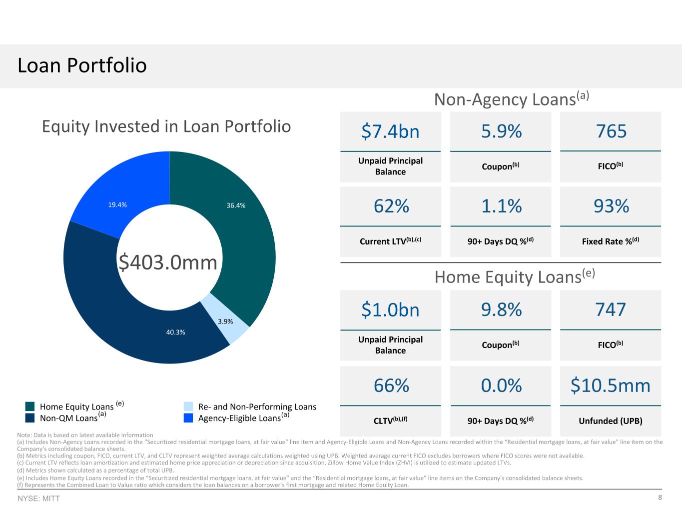 7NYSE:MITT(a)保留的经济权益包括证券化的某些保留部分的公允价值,这些部分要么在公司合并资产负债表的“按公允价值计算的证券化住宅抵押贷款”项目中合并,要么在未合并时,在公司合并资产负债表的“按公允价值计算的房地产证券”项目中合并。(b)证券化贷款指公司合并资产负债表中“证券化住宅抵押贷款,按公允价值”项目中包含的证券化非机构和再/不良贷款。(c)MITT与银行和抵押贷款发起机构合作执行证券化,其作为风险保留要求的保留发起人。来自合伙交易的证券化贷款指(i)公司综合资产负债表中“按公允价值计算的证券化住宅抵押贷款”项目中包含的证券化房屋净值贷款,对于未在公司综合资产负债表中合并的合伙交易,(ii)通过这些交易证券化的贷款的未偿还未付本金余额总额。经济利息留存证券化贷款来自合伙交易的证券化贷款Q4‘21 Q3’25 $ 0.0 $ 2.5 $ 5.0 $ 7.5 $ 10.0经济利息留存证券化贷款共同发起人证券化贷款仓库贷款Q2‘21 Q4’21 Q2‘22 Q4’22 Q2‘23 Q4’23 Q2‘24 Q4’24 02,0004,0004,0006,0008,000证券化活动非机构证券化的程序化发行人,在我们的投资组合上产生有吸引力的股权回报证券化贷款组合增长(十亿美元)经济利息留存共同发起人交易留存证券化贷款仓库贷款Q2‘21 Q3’21 Q4 ' 21Q1‘22 Q2’22 Q3‘22 Q4’22 Q1‘23 Q2’23 Q3‘23 Q4’23 Q1‘24 Q2’2402505007501,0001,2501,5001,5001,5003,0004,5006,0007,500(a)(c)(b)获得贷款显着增长,自2021年以来从Arc Home或第三方发起合作伙伴处获得超过110亿美元的住宅抵押贷款保留债券&再投资由优质非机构借款人抵押的10亿美元证券化中保留的经济权益MITT的证券化战略证券化贷款自2021年以来通过我们的“GCAT”货架或通过与顶级抵押贷款发起人的战略合作伙伴关系执行了29次证券化