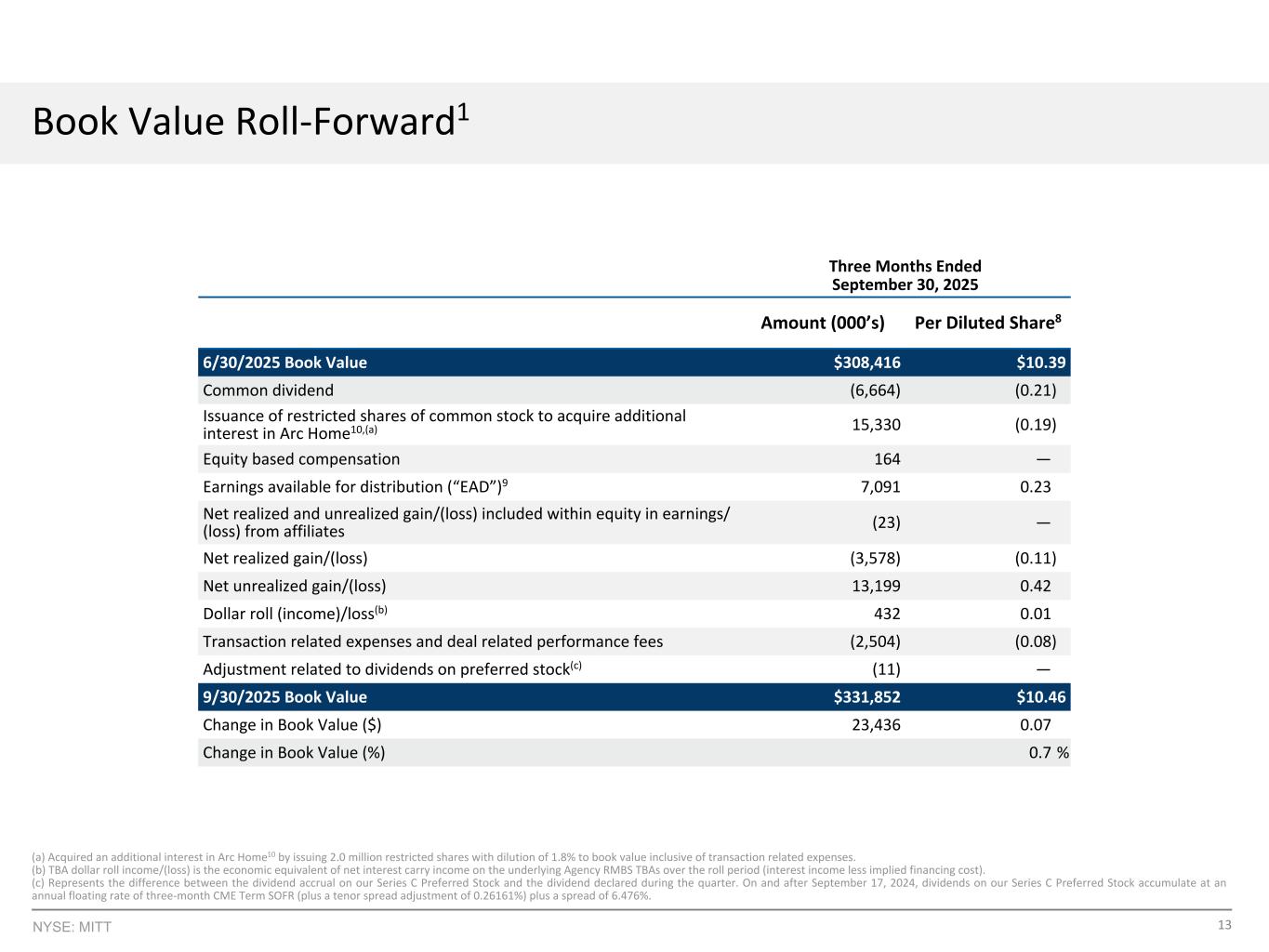 13NYSE:MITT账面价值前滚1截至9月30日的三个月,2025年每股摊薄额(000 ' s)8 6/30/2025账面价值$ 308,416 $ 10.39普通股股息(6,664)(0.21)发行限制性普通股股份以收购Arc Home10的额外权益,(a)15,330(0.19)基于股权的补偿164 —可供分配的收益(“EAD”)97,0910.23净已实现和未实现收益/(损失)包括在附属公司收益/(损失)中的权益中(23)—净已实现收益/(损失)(3,578)(0.11)净未实现收益/(损失)13,1990.42美元滚动(收入)/损失(b)4320.01交易相关费用与交易相关的业绩费用(2,504)(0.08)与优先股股息相关的调整(c)(11)— 9/30/2025账面价值$ 331,852 $ 10.46账面价值变化($)23,4360.07账面价值变化(%)0.7%(a)通过发行200万股限制性股票获得Arc Home10的额外权益,账面价值稀释1.8%,包括交易相关费用。(b)TBA美元展期收入/(损失)是基础机构RMBS TBA在展期期间的净利息套利收入的经济等价物(利息收入减去隐含的融资成本)。(c)表示我们C系列优先股的应计股息与本季度宣布的股息之间的差额。在2024年9月17日及之后,我们C系列优先股的股息将以3个月CME期限SOFR(加上0.26 161%的期限利差调整)加上6.476%的利差的年浮动利率累计。