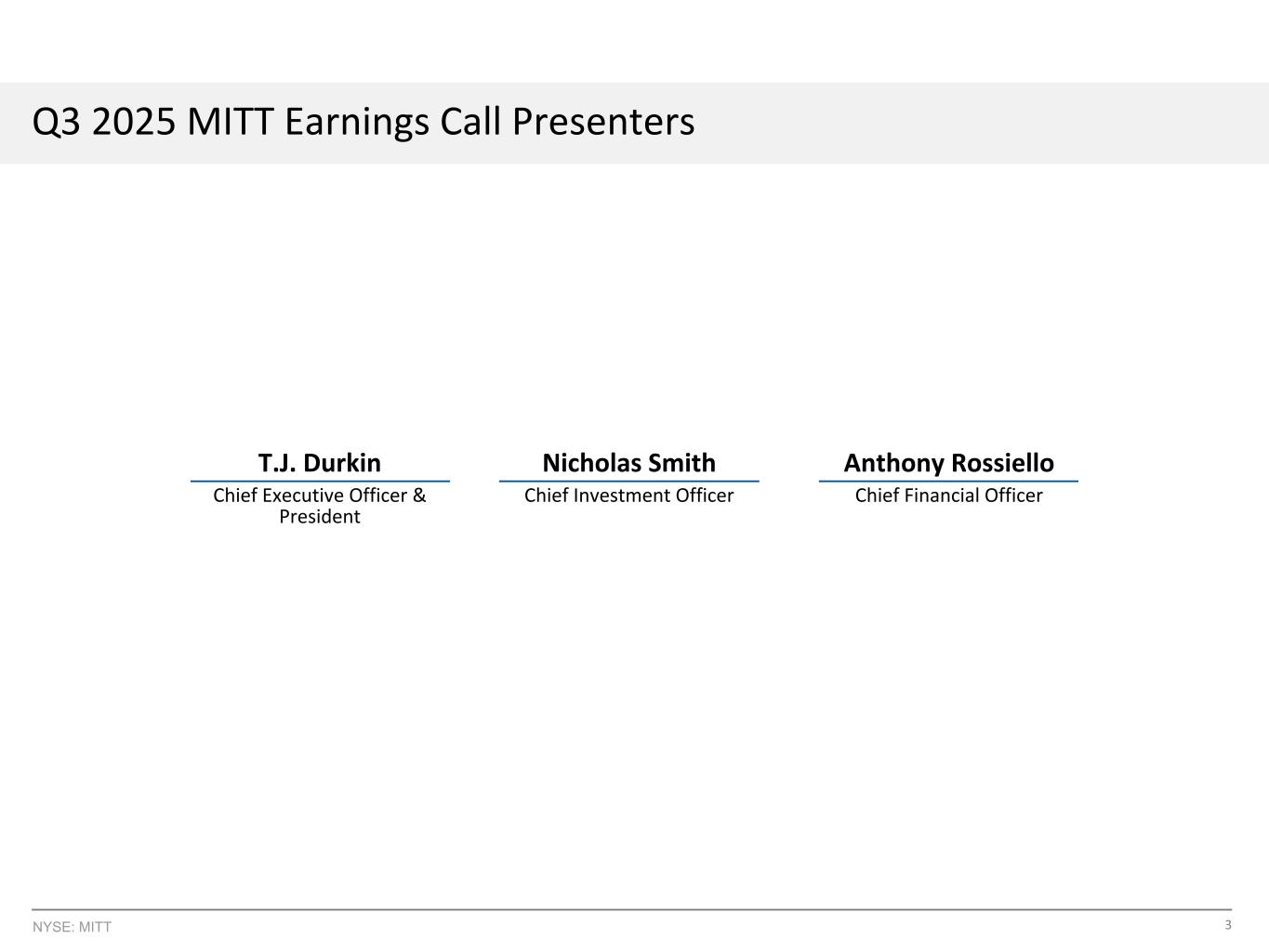 3NYSE:MITT 2025年第三季度MITT财报电话会议主持人T.J. Durkin Nicholas Smith Anthony Rossiello首席执行官兼总裁首席投资官首席财务官