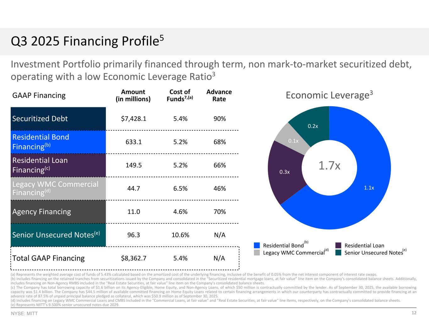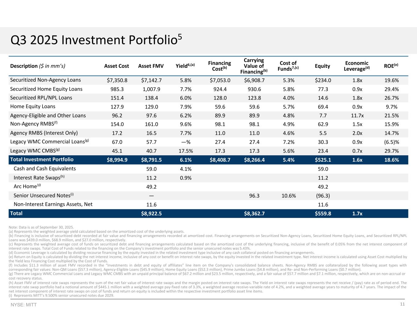 19NYSE:MITT脚注1。账面价值的计算方法是使用股东权益减去我们累积的2.28亿美元可赎回优先股的清算优先权。2.流动资金总额包括5900万美元的现金和现金等价物、4450万美元的某些房屋净值贷款的可用承诺融资以及70万美元的未设押机构RMBS。关于房屋净值贷款的4450万美元可用承诺融资涉及某些融资安排,在这些安排中,我们的交易对手已按合同承诺以质押为抵押品的未付本金余额的87.5%的预付率提供融资,截至2025年9月30日为5090万美元。3.经济杠杆率是一种非GAAP财务指标,计算方法是将总经济杠杆率(包括任何TBA净头寸)除以我们在季度末的GAAP股东权益。季度末的总经济杠杆不包括无追索权融资安排和通过AG Arc LLC使用的任何融资。无追索权融资安排包括证券化债务。我们偿还我们的无追索权融资安排的义务仅限于其下的质押抵押品的价值,并且不会对我们作为一个实体产生一般索赔。4.经济股本回报率是指该期间每股账面价值的变化,加上该期间宣布的普通股息,除以与上一期间相比的每股账面价值。5.投资组合包括住宅投资、代理RMBS以及遗留的WMC商业投资,所有这些投资均以公允价值持有。融资包括以公允价值持有的证券化债务、融资安排、优先无抵押票据。在我们披露投资组合和相关融资的整个演示文稿中,我们提供了这些信息,包括(i)通过对关联公司的投资而拥有的证券,这些证券在GAAP下使用权益法核算,以及(如适用)(ii)TBA的多头头寸,这些证券在GAAP下作为衍生工具核算,但不包括我们的高级无抵押票据。除非另有说明,本演示文稿不包括通过AG Arc LLC持有的投资。6.我们投资的收益率代表一个有效利率,它利用了对未来现金流的所有估计,并根据截至季度末的实际预付款和现金流活动进行了调整。该计算不包括公司持有的现金,也不包括任何TBA净头寸。加权平均收益率是根据我们季度末优秀投资组合的摊余成本计算得出的。7.季度末的资金成本计算为(i)季度末未偿还的追索权融资的加权平均融资成本,(ii)季度末未偿还的无追索权融资的加权平均融资成本,以及(iii)季度末未偿还的利率掉期的净付或收率的加权平均之和。资金成本是根据我们在季度末未偿还融资的摊余成本计算的。8.稀释后的每股数字是根据公认会计原则使用稀释后的加权平均流通股计算得出的。9.我们将非公认会计准则财务指标EAD定义为普通股股东可获得的净收入/(亏损),不包括(i)(a)贷款、房地产证券、衍生品和其他投资(包括我们对AG Arc的投资)的未实现收益/(亏损),以及(b)出售或终止此类工具的已实现净收益/(亏损),(ii)与我们的投资的收购、处置或证券化相关的任何交易相关费用以及与WMC收购相关的交易相关费用,(iii)应付第三方运营商的应计交易相关履约费用,前提是应计项目的主要组成部分与不包括在EAD中的项目有关,例如未实现和已实现的收益/(损失),(iv)Arc Home的净抵押贷款服务权和旨在抵消这些净抵押贷款服务权公允价值变化的衍生工具的已实现和未实现的公允价值变化,(v)在我们的应税REIT子公司确认的递延税款(如有),(vi)确认的任何议价购买收益,以及(vii)某些其他非经常性收益或损失。上述(i)至(vii)项包括与附属实体持有的这些项目有关的任何金额。上文(ii)中提及的与交易相关的费用主要包括在执行我们的证券化以及获得或处置住宅抵押贷款之前或之时发生的成本。这些费用是非经常性的,可能包括承销费、律师费、勤勉费用和其他类似的交易相关费用。经常性费用,如服务费、保管费、 受托人费用和其他类似的持续费用不排除在可供分配的收益之外。管理层认为与交易相关的费用类似于在收购、处置或资产证券化时发生的已实现损失,并不将其视为其核心业务的一部分。管理层认为,上述(iv)中描述的排除与其计算剩余投资组合的EAD的方式是一致的。管理层排除了所有递延税,因为它认为递延税不代表当前的运营。EAD包括在收益率调整基础上我们的投资所赚取的净利息收入和其他收入,包括利率掉期的净利息部分、TBA美元滚动收入/(损失),或任何其他可能赚取或支付净利息或其经济等价物的投资活动。此外,EAD还包括来自Arc Home的净营业收入/(亏损)。10.我们通过权益法被投资方之一AG Arc LLC投资于持牌抵押贷款发起机构Arc Home LLC。截至2025年9月30日,我们对AG Arc LLC的投资为4920万美元,占66.0%的所有权权益。