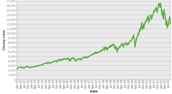 | 纳斯达克100指数®–历史收盘价 2012年1月3日至2022年9月9日 |