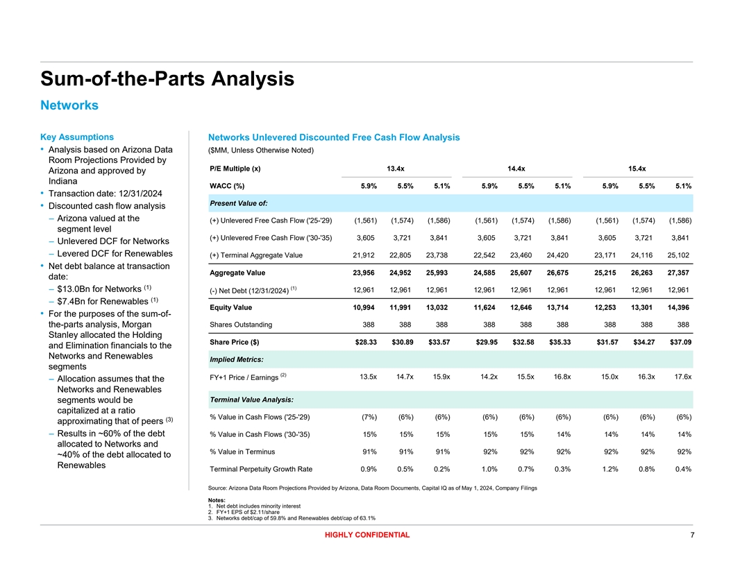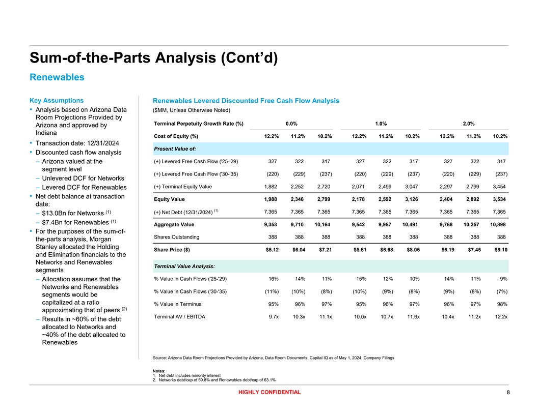 部分总和分析网络关键假设网络无杠杆贴现自由现金流分析•基于亚利桑那州数据的分析($ mm,除非另有说明)P/E倍数(x)提供的房间预测13.4x 14.4x 15.4x Arizona并获印第安纳州WACC批准(%)5.9% 5.5% 5.1% 5.9% 5.5% 5.1% 5.9% 5.5% 5.1% •交易日期:12/31/2024现值:•折现现金流分析– Arizona估值为(+)无杠杆自由现金流(‘25-’29)(1,561)(1,574)(1,586)(1,561)(1,574)(1,586)分部水平(+)无杠杆自由现金流(‘30-’35)3,6053,7213,8413,6053,7213,8413,6053,7213,8413,6053,7213,841 –网络无杠杆DCF –杠杆DCF可再生能源(+)终端总值21,91222,80523,73822,54223,46024,42023,17124,11625,102 •交易时净债务余额总值23,95624,95225,99324,58525,60726,67525,21526,26327,357日期:(1)(1)– $ 130 bn for Networks 12,96112,96112,96112,96112,96112,96112,96112,96112,961(-)净债务(12/31/2024)(1)– $ 74 bn for Renewables equity value 10,99411,99113,03211,62412,64613,71412,25313,30114,396 •就部分之和Morgan Shares Outstanding 388388388388388388388 Stanley allocated the holding share price($)$ 28.33 $ 30.89 $ 33.57 $ 29.95 $ 32.58 $ 35.33 $ 31.57 $ 34.27 $ 37.09 and elimination financials to the networks and Renewables implied metrics:segments(2)13.5x 14.7x 15.9x 14.2x 15.5x 16.8x 15.0x 16.3x 17.6x FY + 1 Price/Earnings – Allocation assumes that the networks and Renewables terminal value Analysis:segments will be capitalized at a ratio % value in cash flow(‘25-’同行–结果~60%的债务现金流中%价值(‘30-’35)15% 15% 15% 15% 15% 14% 14% 14% 14%分配给网络和总值% 91% 91% 91% 91% 92% 92% 92% 92% 92% 92% 92%~40%的债务分配给可再生能源终端永续增长率0.9% 0.5% 0.2% 1.0% 0.7% 0.3% 1.2% 0.8% 0.4%资料来源:亚利桑那州提供的亚利桑那州数据室预测、数据室文件、截至2024年5月1日的Capital IQ,公司文件说明:1。净债务包括少数股东权益2。FY + 1 EPS为2.11美元/股3。Networks债务/上限为59.8%和Renewables债务/上限为63.1%高度机密7