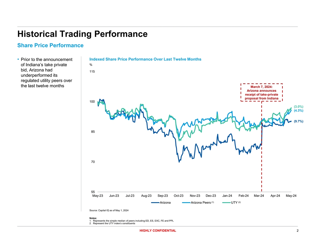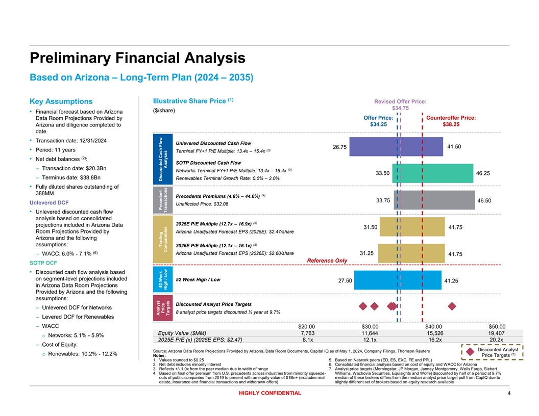 基于亚利桑那州的初步财务分析–长期计划(2024 – 2035年)(1)说明性股价修正发售价:关键假设34.75美元(美元/股)•基于亚利桑那州发售价的财务预测:还盘价格:数据室预测由34.25美元提供38.25美元亚利桑那州交易日期:12/31/2024无杠杆贴现现金流26.75 41.50 •期间:11年(3)终端FY + 1 P/E倍数:13.4x – 15.4x(2)•净债务余额:SOTP贴现现金流–交易日期:203亿美元(3)Networks Terminal FY + 1 P/E倍数:13.4x – 15.4x 33.50 46.25 –最终日期:388亿美元可再生能源终端增长率:0.0% – 2.0% •完全稀释后流通股388mm(4)先例溢价(4.8% – 44.6%)33.75 46.50无杠杆DCF未影响价格:32.08美元•基于综合(5)2025年市盈率(12.7x – 16.9x)预测的无杠杆贴现现金流分析亚利桑那州数据中包含的31.50 41.75房间预测由亚利桑那州提供未经调整的预测EPS(2025E):2.47美元/股亚利桑那州和以下(5)假设:2026年市盈率倍数(12.1x – 16.1x)(6)亚利桑那州未经调整的预测EPS(2026E):2.60美元/股31.25 – WACC:6.0%-7.1% 41.75仅参考SOTP DCF •基于细分层面预测的贴现现金流分析包括亚利桑那州提供的亚利桑那州数据室预测中的52周高/低27.50 41.25以及以下假设:折现分析师价格目标– Networks 8的无杠杆DCF分析师价格目标折现半年9.7% –可再生能源的杠杆DCF – WACC $ 20.00 $ 30.00 $ 40.00 $ 50.00股权价值($ mm)7,76311,64415,52619,407 o Networks:5.1%-5.9% 2025E P/E(x)(2025E EPS:$ 2.47)8.1x 12.1x 16.2x 20.2x –权益成本:折现分析师资料来源:Arizona提供的Arizona Data Room Projections、Data Room Documents、Capital IQ截至2024年5月1日、公司备案、汤森路透 o Renewables:10.2%-12.2%(7)注:价格目标1。数值四舍五入至0.25美元5。基于网络同行(ED、ES、EXC、FE和PPL)2。净债务包括少数股东权益6。亚利桑那州3基于权益成本和WACC的合并财务分析。由于范围7的宽度,从同行中值反映+/-1.0x。分析师目标价(晨星信息,JP Morgan,Janney Montgomery,富国银行,Siebert 4。基于来自少数股权挤压的跨行业美国先例的最终报价溢价-威廉姆斯、Wachovia Securities、Equisights和Wolfe)以9.7%的半年期折扣,将2019年至今股权价值为10亿美元+的上市公司(不包括这些券商的实际中位数与由于房地产、保险和金融交易以及撤回报价而导致的分析师目标价格从CapIQ中拉出的中值不同)略有不同的一组券商基于可获得的股权研究高度机密4分析师52周交易先例折现现金流价格高/低可比交易分析目标