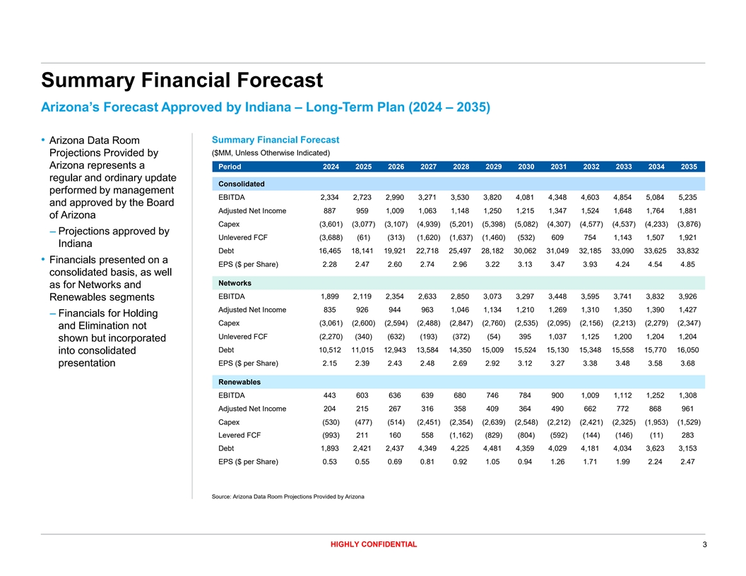 财务预测摘要亚利桑那州预测获印第安纳州批准–长期计划(2024 – 2035年)财务预测摘要•亚利桑那州数据室($ mm,除非另有说明)亚利桑那州提供的预测代表期间202420252026202720282029203020312032203320342035由管理层执行的合并定期和普通更新EBITDA 2,3342,7232,9903,2713,5303,8204,0814,3484,6034,8545,0845,235并经董事会批准调整后净收益8879591,0091,0631,1481,2501,2151,3471,5241,6481,7641,881亚利桑那州资本支出(3,601)(3,077)(3,107)(4,939)(5,201)(5,398)(5,082)(4,307)(4,577)(4,537)(4,233)(3,876)–无杠杆FCF批准的预测(3,688)(61)(313)(1,620)(1,637)(1,460)(532)6097541,1431,5071,921印第安纳州债务16,46518,14119,92122,71825,49728,18230,06231as well Networks as for Networks and EBITDA 1,8992,1192,3542,6332,8503,0733,2973,4483,5953,7413,8323,926 Renewables segments Adjusted Net Income 8359269449631,0461,1341,2101,2691,3101,3501,3901,427 – Financial for Holding Capex(3,061)(2,600)(2,594)(2,488)(2,847)(2,760)(2,535)(2,095)(2,156)(2,213)(2,279)(2,347)和消除未无杠杆的FCF(2,270)(340)(632)(193)(372)(54)3951,0371,1251,20121,2041,204显示但将债务10,51211,01512,94313,58414,35015,00915,52415,13015,34815,55815,77016,050并入合并列报EPS(每股美元)2.15 2.39 2.43 2.48 2.69 2.92 3.12 3.27 3.38 3.48 3.58 3.68 Renewables EBITDA 4436036366396807467849001,0091,1121,2521,308调整后净收入204215267316358409364490662772868961 Capex(530)(477)(514)(2,451)(2,354)(2,639)(2,548)(2,212)(2,421)(2,325)(1,953)4,0343,6233,153 EPS(每股美元)0.53 0.55 0.69 0.8 10.92 1.05 0.94 1.26 1.71 1.99 2.24 2.47资料来源:Arizona Data Room Projections由Arizona Highly Confidential 3提供