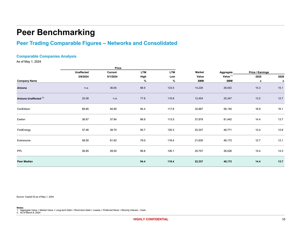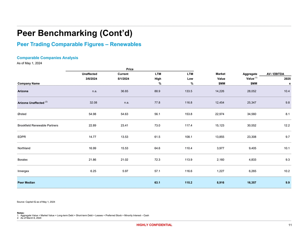 Peer Benchmarking Peer Trading Comparable Figures – Networks and Consolidated Comparable Companies Analysis As of May 1,2024价格不受影响当前LTM LTM市场总价格/收益(1)价值3/6/20245/1/2024高低值20252026公司名称%% $ MM $ MM x x Arizona n.a. 36.6588.91 33.5 14,22628,05215.3 15.1(2)32.08 n.a. 77.81 16.812,45425,34713.21 2.7 Arizona unaffected ConEdison 89.85 94.80 94.41 17.832,86756,14516.9 16.1 爱克斯龙 36.67 37.67 37.84 86.91 13.537,87981,44214.41 3.7 FirstEnergy 37.46 38.70 95.71 20.322,33746,77113.41 2.6 Eversource 58.5061.6279.01 18.421,63048,17212。13.7资料来源:Capital IQ截至2024年5月1日注:1。总值=市值+长期债务+短期债务+租赁+优先股+少数股东权益–现金2。截至2024年3月6日高度机密10