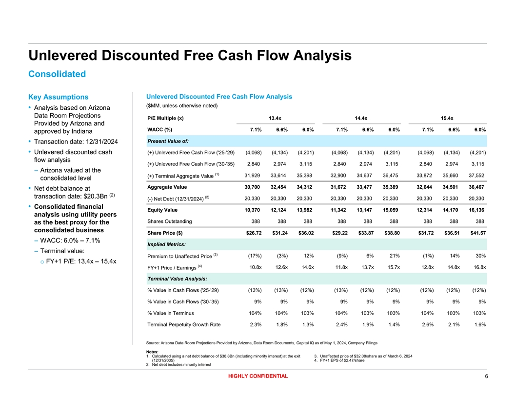 无杠杆贴现自由现金流分析合并无杠杆贴现自由现金流分析关键假设(百万美元,除非另有说明)•基于亚利桑那州数据机房预测P/E倍数(x)的分析13.4x 14.4x 15.4x由亚利桑那州提供和WACC(%)7.1% 6.6% 6.0% 7.1% 6.6% 6.0% 7.1% 6.6% 6.0%印第安纳州批准的现值:•交易日期:12/31/2024 •无杠杆贴现现金(+)无杠杆自由现金流(‘25-’29)(4,068)(4,134)(4,201)(4,068)(4,134)(4,201)(4,068)(4,134)(4,201)流量分析(+)无杠杆自由现金流(‘30-’35)2,8402,9743,1152,8402,9743,1152,8402,9743,1152,9402,9743,115 –亚利桑那州价值(1)31,92933,61435,39832,90034,63736,47533,87235,620,33020,33020,33020,33020,33020,33020,33020,330(-)净债务(12/31/2024)•合并金融股权价值10,37012,12413,98211,34213,14715,05912,31414,17016,136分析使用公用事业同行股票流通股388388388388388388388388388388388388作为最佳代理综合业务股价($)$ 26.72 $ 31.24 $ 36.02 $ 29.22 $ 33.87 $ 38.80 $ 31.72 $ 36.51 $ 41.57 – WACC:6.0% – 7.1%隐含指标:–终值:(3)(17%)(3%)12%(9%)6% 21%(1%)14% 30%较未受影响价格溢价o FY + 1 P/E:13.4x – 15.4x(4)10.8x 12.6x 14.6x 11.8x 13.7x 15.7x 12.8x 14.8x 16.8x FY + 1 Price/Earnings Terminal Value Analysis:% Value in Cash Flow(‘25-’29)(13%)(13%)(13%)(12%)(12%)(12%)(12%)(12%)(12%)(12%)(12%)(12%)(12%)(104% 103% 103% 104% 103% 103%终端永续增长率2.3% 1.8% 1.3% 2.4% 1.9% 1.4% 2.6% 2.1% 1.6%资料来源:Arizona提供的Arizona Data Room Projections,Data Room Documents,Capital IQ截至2024年5月1日,公司备案说明:1。使用退出时的净债务余额388亿美元(包括少数股东权益)计算3。截至2024年3月6日(12/31/2035)4的未受影响价格为32.08美元/股。FY + 1 EPS为2.47美元/股2。净债务包括少数股东权益高度机密6