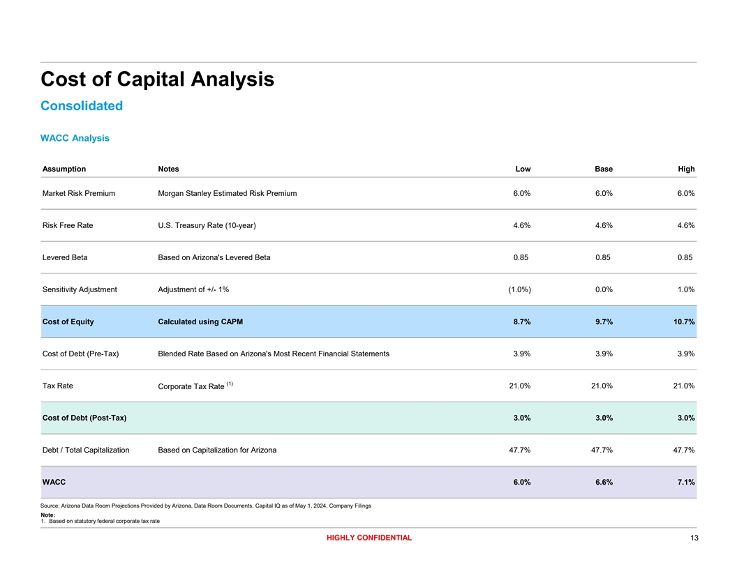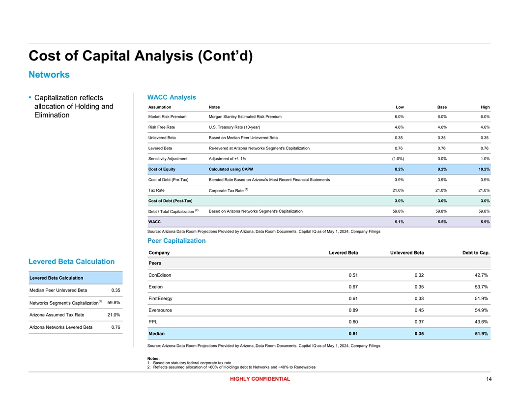 资本成本分析合并WACC分析假设票据低基数高市场风险溢价摩根士丹利估计风险溢价6.0% 6.0% 6.0%无风险利率美国国债利率(10年期)4.6% 4.6% 4.6%基于亚利桑那州杠杆贝塔的杠杆贝塔0.85 0.85 0.85敏感性调整调整+/-1%(1.0%)0.0% 1.0%权益成本计算使用CAPM8.7 % 9.7% 10.7%债务成本(税前)混合率基于亚利桑那州最近财务报表3.9% 3.9% 3.9%(1)税率21.0% 21.0%公司税率债务成本(税后)3.0% 3.0%债务/基于资本化的总资本亚利桑那州47.7% 47.7% 47.7% WACC 6.0% 6.6% 7.1%资料来源:亚利桑那州提供的亚利桑那州数据室预测、数据室文件、截至2024年5月1日的Capital IQ,公司备案注:1。基于法定联邦公司税率高度保密13