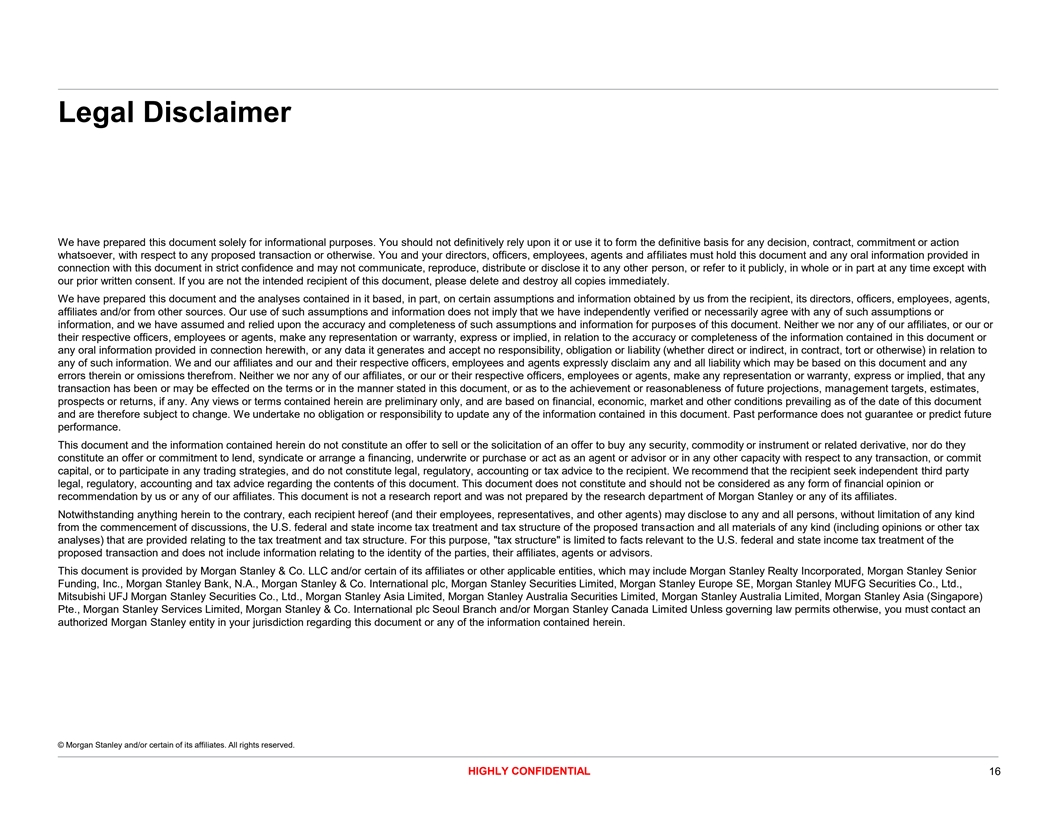 法律免责声明我们编制本文件仅供参考。您不应明确依赖它或使用它来构成任何决定、合同、承诺或行动的最终基础,关于任何提议的交易或其他方面。您和您的董事、高级职员、雇员、代理人和关联机构必须严格保密地持有本文件以及就本文件提供的任何口头信息,不得在任何时候向任何其他人传达、复制、分发或披露,或公开、全部或部分引用,除非我们事先书面同意。如果您不是本文件的预定收件人,请立即删除并销毁所有副本。我们编制这份文件以及其中所载的分析,部分是基于我们从收件人、其董事、高级职员、雇员、代理人、关联公司和/或其他来源获得的某些假设和信息。我们使用此类假设和信息并不意味着我们已独立验证或必然同意任何此类假设或信息,并且我们已为本文件的目的假设并依赖此类假设和信息的准确性和完整性。我们或我们的任何关联公司,或我们或他们各自的高级职员、雇员或代理人,均不对本文件所载信息或与此相关的任何口头信息的准确性或完整性作出任何明示或暗示的陈述或保证,或其生成的任何数据,并且不接受与任何此类信息有关的任何责任、义务或责任(无论是直接或间接、合同、侵权或其他方面)。我们和我们的关联公司以及我们和他们各自的高级职员、雇员和代理人明确表示不承担可能基于本文件及其任何错误或遗漏的任何和所有责任。我们或我们的任何关联公司,或我们或他们各自的高级职员、雇员或代理人,均不对任何交易已经或可能按照本文件所述的条款或方式进行,或对未来预测、管理目标、估计、前景或回报(如有)的实现或合理性作出任何明示或暗示的陈述或保证。此处包含的任何观点或条款仅为初步观点,并基于截至本文件发布之日的财务、经济、市场和其他条件,因此可能会发生变化。我们不承担更新本文件中包含的任何信息的义务或责任。过往业绩不保证或预测未来业绩。本文件和此处包含的信息不构成出售要约或购买任何证券、商品或工具或相关衍生工具的要约邀请,也不构成出借、银团或安排融资、承销或购买或就任何交易担任代理或顾问或以任何其他身份,或承诺资本,或参与任何交易策略的要约或承诺,也不构成对接收方的法律、监管、会计或税务建议。我们建议收件人就本文件的内容寻求独立的第三方法律、监管、会计和税务建议。本文件不构成也不应被视为我们或我们的任何关联公司的任何形式的财务意见或建议。本文件不是研究报告,也不是由摩根士丹利研究部或其任何关联机构编制。尽管本文中有任何相反的规定,本文的每个接收者(及其雇员、代表和其他代理人)可以从讨论开始时不受任何种类限制地向任何和所有人披露拟议交易的美国联邦和州所得税待遇和税收结构以及提供的与税收待遇和税收结构有关的任何种类的所有材料(包括意见或其他税收分析)。为此,税收结构仅限于与拟议交易的美国联邦和州所得税处理相关的事实,不包括与各方、其关联公司、代理人或顾问的身份相关的信息。本文件由摩根士丹利 & Co. LLC和/或其某些关联公司或其他适用实体提供,这些实体可能包括摩根士丹利 Realty Incorporated、摩根士丹利 Senior Funding,Inc.、摩根士丹利 Bank,N.A.、摩根士丹利 & Co. International plc、摩根士丹利 Securities Limited、摩根士丹利TERMEurope SE、摩根士丹利MUFGTERM8 Securities Co.,Ltd.、Mitsubishi UFJ 摩根士丹利 Securities Co.,Ltd.、摩根士丹利TERM亚洲有限公司、摩根士丹利TERM11 Australia Securities Limited、摩根士丹利 Australia Limited、摩根士丹利TERMAsia(Singapore)Pte., 摩根士丹利服务有限公司、摩根士丹利 & Co. International PLC首尔分公司和/或摩根士丹利 Canada Limited除非管辖法律另有许可,否则您必须就本文件或此处包含的任何信息与您所在司法管辖区的授权摩根士丹利实体联系。© 摩根士丹利和/或其某些关联公司。版权所有。高度保密16