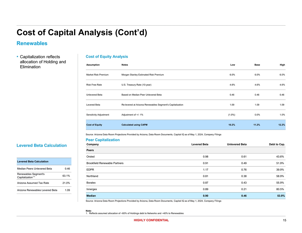 资本成本分析(cont’d)网络WACC分析•资本化反映了持有的分配和假设说明低基数高消除市场风险溢价摩根士丹利估计风险溢价6.0% 6.0% 6.0%无风险利率美国国债利率(10年期)4.6% 4.6% 4.6%基于同行中位数无杠杆Beta的无杠杆Beta 0.35 0.35 0.35再杠杆Beta在Arizona Networks部门的资本化0.76 0.76 0.76敏感性调整调整+/-1%(1.0%)0.0% 1.0%权益成本使用CAPM8.2 % 9.2% 10.2%债务成本(税前)混合率计算基于亚利桑那州最近财务报表3.9% 3.9% 3.9%(1)税率公司税率21.0% 21.0% 21.0%债务成本(税后)3.0% 3.0%(2)债务/总资本基于Arizona Networks Segment的资本化59.8% 59.8% 59.8% WACC 5.1% 5.5% 5.9%资料来源:Arizona提供的Arizona Data Room Projections,Data Room Documents,Capital IQ截至2024年5月1日,Company Filings Peer Capitalization Company Levered Beta Unlevered Beta Debt to Cap。杠杆Beta计算同行ConEdison 0.5 10.3242.7%杠杆Beta计算爱克斯龙 0.67 0.3553.7%中位同行无杠杆Beta 0.35 FirstEnergy 0.6 10.33 51.9%(2)(2)59.8% Networks Segment的资本化Eversource 0.89 0.4554.9% Arizona假定税率21.0% PPL 0.60 0.3743.6% Arizona Networks杠杆Beta 0.76中位数0.6 10.3551.9%资料来源:Arizona提供的Arizona Data Room Projections、Data Room Documents、Capital IQ截至2024年5月1日,公司备案说明:1。基于法定联邦公司税率2。反映假设将控股债务的~60%分配给Networks,将~40%分配给可再生能源高度机密14