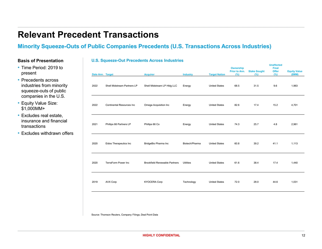 Peer Benchmarking(Cont'd)Peer Trading Comparable Figures – Renewables Comparable Companies Analysis As of May 1,2024价格不受影响当前LTM LTM市场合计AV/EBITDA(1)3/6/20245/1/2024高低价值2025公司名称%% $ MM $ MM x Arizona n.a. 36.6588.91 33.5 14,22628,052 10.4(2)Arizona unaffected 32.08 n.a. 77.81 16.812,45425,3479.8 Ø rsted 54.98 54.63 56.11 53.822,97434,5608.1 布鲁克菲尔德可再生 Partners 22.89 23.4173.01 17.415,12330,55212.2 EDPR 14.77 13.5361.5 108.113,85523,3089.7 Northland 16.99 15.53 64.61 10.43,9779,40510.1 Boralex 21.86 21.02 2.3113.92,1604,89.9资料来源:Capital IQ截至2024年5月1日注:1。总值=市值+长期债务+短期债务+租赁+优先股+少数股东权益–现金2。截至2024年3月6日高度机密11