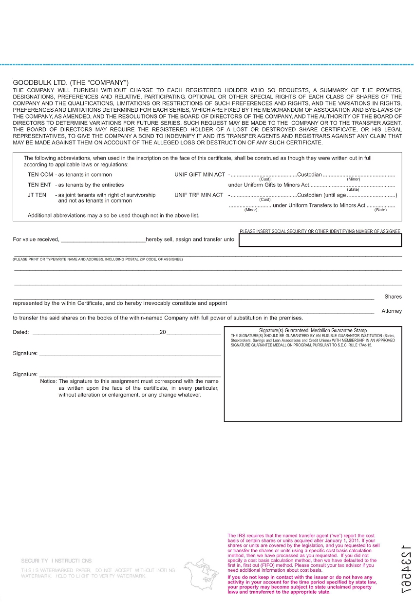 GOODBULK LTD. (THE “COMPANY”) THE COMPANY WILL FURNISH WITHOUT CHARGE TO EACH REGISTERED HOLDER WHO SO REQUESTS, A SUMMARY OF THE POWERS, DESIGNATIONS, PREFERENCES AND RELATIVE, PARTICIPATING, OPTIONAL OR OTHER SPECIAL RIGHTS OF EACH CLASS OF SHARES OF THE COMPANY AND THE QUALIFICATIONS, LIMITATIONS OR RESTRICTIONS OF SUCH PREFERENCES AND RIGHTS, AND THE VARIATIONS IN RIGHTS, PREFERENCES AND LIMITATIONS DETERMINED FOR EACH SERIES, WHICH ARE FIXED BY THE MEMORANDUM OF ASSOCIATION AND BYE-LAWS OF THE COMPANY, AS AMENDED, AND THE RESOLUTIONS OF THE BOARD OF DIRECTORS OF THE COMPANY, AND THE AUTHORITY OF THE BOARD OF DIRECTORS TO DETERMINE VARIATIONS FOR FUTURE SERIES. SUCH REQUEST MAY BE MADE TO THE COMPANY OR TO THE TRANSFER AGENT. THE BOARD OF DIRECTORS MAY REQUIRE THE REGISTERED HOLDER OF A LOST OR DESTROYED SHARE CERTIFICATE, OR HIS LEGAL REPRESENTATIVES, TO GIVE THE COMPANY A BOND TO INDEMNIFY IT AND ITS TRANSFER AGENTS AND REGISTRARS AGAINST ANY CLAIM THAT MAY BE MADE AGAINST THEM ON ACCOUNT OF THE ALLEGED LOSS OR DESTRUCTION OF ANY SUCH CERTIFICATE.The following abbreviations, when used in the inscription on the face of this certificate, shall be construed as though they were written out in fullaccording to applicable laws or regulations: TEN COM -as tenants in common UNIF GIFT MIN ACT -............................................Custodian ................................................ (Cust) (Minor) TEN ENT -as tenants by the entireties under Uniform Gifts to Minors Act......................................................... (State) JT TEN -as joint tenants with right of survivorship UNIF TRF MIN ACT -............................................Custodian (until age ................................) and not as tenants in common (Cust) .............................under Uniform Transfers to Minors Act ................... (Minor) (State)Additional abbreviations may also be used though not in the above list.PLEASE INSERT SOCIAL SECURITY OR OTHER IDENTIFYING NUMBER OF ASSIGNEEFor value received, ____________________________hereby sell, assign and transfer unto(PLEASE PRINT OR TYPEWRITE NAME AND ADDRESS, INCLUDING POSTAL ZIP CODE, OF ASSIGNEE)_______________________________________________________________________________________________________________________ Shares represented by the within Certificate, and do hereby irrevocably constitute and appoint _______________________________________________________________________________________________________________________ Attorney to transfer the said shares on the books of the within-named Company with full power of substitution in the premises.Dated: __________________________________________20 __________________ Signature(s) Guaranteed: Medallion Guarantee StampTHE SIGNATURE(S) SHOULD BE GUARANTEED BY AN ELIGIBLE GUARANTOR INSTITUTION (Banks, Stockbrokers, Savings and Loan Associations and Credit Unions) WITH MEMBERSHIP IN AN APPROVED SIGNATURE GUARANTEE MEDALLION PROGRAM, PURSUANT TO S.E.C. RULE 17Ad-15. Signature: ____________________________________________________________ Signature: ____________________________________________________________ Notice: The signature to this assignment must correspond with the name as written upon the face of the certificate, in every particular, without alteration or enlargement, or any change whatever.The IRS requires that the named transfer agent (“we”) report the cost basis of certain shares or units acquired after January 1, 2011. If your shares or units are covered by the legislation, and you requested to sell or transfer the shares or units using a specific cost basis calculation method, then we have processed as you requested. If you did not specify a cost basis calculation method, then we have defaulted to the first in, first out (FIFO) method. Please consult your tax advisor if you need additional information about cost basis.If you do not keep in contact with the issuer or do not have any activity in your account for the time period specified by state law, your property may become subject to state unclaimed property laws and transferred to the appropriate state.