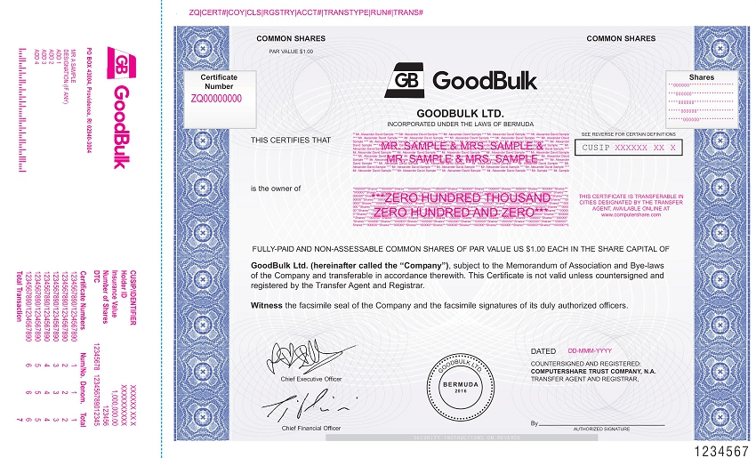 COMMON SHARES PAR VALUE $1.00 Certificate Number ZQ00000000 THIS CERTIFIES THAT is the owner of GOODBULK LTD. INCORPORATED UNDER THE LAWS OF BERMUDA ** Mr. Alexander David Sample **** Mr. Alexander David Sample **** Mr. Alexander David Sample **** Mr. Alexander David Sample **** Mr. Alexander David Sample **** Mr. Alexander David Sample **** Mr. Alexander David Sample **** Mr. Alexander David Sample **** Mr. Alexander David Sample **** Mr. Alexander David Sample **** Mr. Alexander David Sample **** Mr. Alexander David Sample **** Mr. Alexander David Sample **** Mr. Alexander David Sample **** Mr. Alexander David Sample **** Mr. Alexander David Sample **** Mr. Alexander David Sample **** Mr. Alexander David Sample **** Mr. Alexander David Sample **** Mr. Alexander David Sample **** Mr. Alexander David Sample **** Mr. Alexander David Sample **** Mr. Alexander David Sample **** Mr. Alexander David Sample **** MR. SAMPLE & MRS. SAMPLE & Mr. Alexander David Sample **** Mr. Alexander David Sample **** Mr. Alexander David Sample **** Mr. Alexander David Sample **** Mr. Alexander David Sample **** Mr. Alexander David Sample **** Mr. Alexander David Sample **** Mr. Alexander David Sample **** Mr. Alexander David Sample **** Mr. Alexander David Sample **** Mr. Alexander David Sample **** Mr. Alexander David Sample **** Mr. Alexander David Sample **** Mr. Alexander David Sample **** Mr. Alexander MR. SAMPLE & MRS. SAMPLE David Sample **** Mr. Alexander David Sample **** Mr. Alexander David Sample **** Mr. Alexander David Sample **** Mr. Alexander David Sample **** Mr. Alexander David Sample **** Mr. Alexander David Sample **** Mr. Alexander David Sample **** Mr. Alexander David Sample **** Mr. Alexander David Sample **** Mr. Alexander David Sample **** Mr. Alexander David Sample **** Mr. Alexander David Sample **** Mr. Alexander David Sample **** Mr. Sample **** Mr. Sample **000000**Shares****000000**Shares****000000**Shares****000000**Shares****000000**Shares****000000**Shares****000000**Shares****000000**Shares*** *000000**Shares****000000**Shares****000000**Shares****000000**Shares****000000**Shares****000000**Shares****000000**Shares****000000**Shares**** 000000**Shares****000000**Shares****000000**Shares****000000**Shares****000000**Shares****000000**Shares****000000**Shares****000000**Shares****0 00000**Shares****000000**Shares****000000**Shares****000000**Shares****000000**Shares****000000**Shares****000000**Shares****000000**Shares****00 ***ZERO HUNDRED THOUSAND 0000**Shares****000000**Shares****000000**Shares****000000**Shares****000000**Shares****000000**Shares****000000**Shares****000000**Shares****000 000**Shares****000000**Shares****000000**Shares****000000**Shares****000000**Shares****000000**Shares****000000**Shares****000000**Shares****0000 00**Shares****000000**Shares****000000**Shares****000000**Shares****000000**Shares****000000**Shares****000000**Shares****000000**Shares****00000 0**Shares****000000**Shares****000000**Shares****000000**Shares****000000**Shares****000000**Shares****000000**Shares****000000**Shares****000000 ZERO HUNDRED AND ZERO*** **Shares****000000**Shares****000000**Shares****000000**Shares****000000**Shares****000000**Shares****000000**Shares****000000**Shares****000000* *Shares****000000**Shares****000000**Shares****000000**Shares****000000**Shares****000000**Shares****000000**Shares****000000**Shares****000000** Shares****000000**Shares****000000**Shares****000000**Shares****000000**Shares****000000**Shares****000000**Shares****000000**Shares****000000**S COMMON SHARES Shares * * 000000****************** * * * 000000***************** **** 000000**************** ***** 000000*************** ****** 000000************** SEE REVERSE FOR CERTAIN DEFINITIONS CUSIP XXXXXX XX X THIS CERTIFICATE IS TRANSFERABLE IN CITIES DESIGNATED BY THE TRANSFER AGENT, AVAILABLE ONLINE AT www.computershare.com PO BOX 43004, Providence, RI 02940-3004 MR A SAMPLE DESIGNATION (IF ANY) ADD 1 ADD 2 ADD 3 ADD 4 CUSIP/IDENTIFIERHolder IDInsurance Value Number of SharesDTC Certificate Numbers 1234567890/12345678901234567890/12345678901234567890/12345678901234567890/12345678901234567890/12345678901234567890/1234567890 Total Transaction XXXXXX XX XXXXXXXXXXX1,000,000.00123456 12345678 123456789012345 Num/No. Denom. Total 1 1 1 2 2 2 3 3 3 4 4 4 5 5 5 6 6 6 7 FULLY-PAID AND NON-ASSESSABLE COMMON SHARES OF PAR VALUE US $1.00 EACH IN THE SHARE CAPITAL OF GoodBulk Ltd. (hereinafter called the “Company”), subject to the Memorandum of Association and Bye-laws of the Company and transferable in accordance therewith. This Certificate is not valid unless countersigned and registered by the Transfer Agent and Registrar. Witness the facsimile seal of the Company and the facsimile signatures of its duly authorized officers. Chief Executive Officer Chief Financial Officer BERMUDA 2016 GOODBULKLTD. DATED DD-MMM-YYYY COUNTERSIGNED AND REGISTERED: COMPUTERSHARE TRUST COMPANY, N.A. TRANSFER AGENT AND REGISTRAR, By AUTHORIZED SIGNATURE