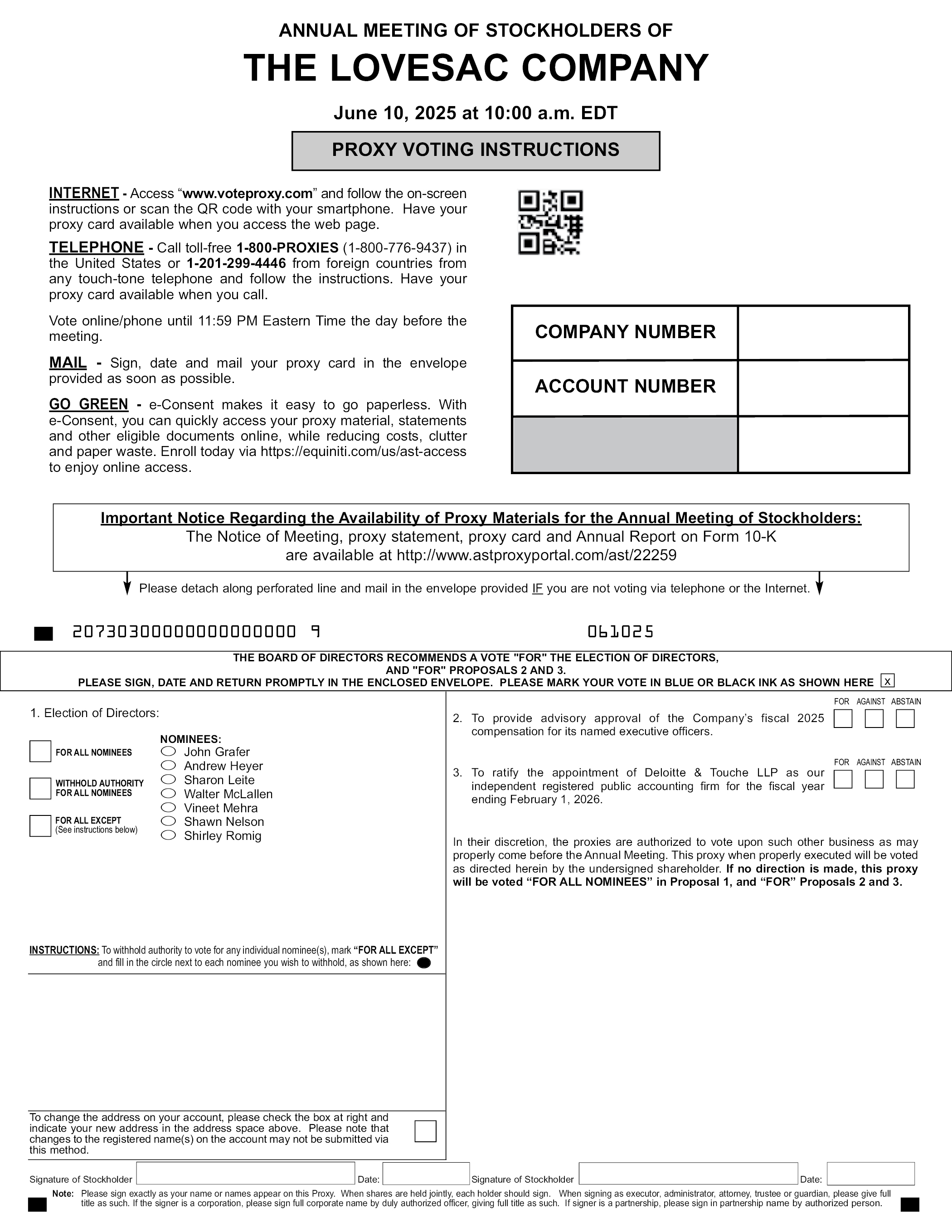 LOVESAC公司股东年度会议2025年6月10日上午10:00 EDT代理投票说明互联网-访问“www.voteproxy.com”并按照屏幕上的说明或使用智能手机扫描二维码。当您访问网页时,请准备好您的代理卡。电话-在美国拨打免费电话1-800-PROXIES(1-800-776-9437)或从外国拨打1-201-299-4446从任何按键式电话并按指示操作。打电话时准备好代理卡。在线/电话投票至会议前一天美国东部时间晚上11:59。邮寄-尽快在提供的信封中签署、注明日期并邮寄您的代理卡。GO GREEN-e-Consent让无纸化变得简单。使用e-Consent,您可以快速在线访问您的代理材料、报表和其他符合条件的文件,同时减少成本、杂乱和纸张浪费。今天通过https://equiniti.com/us/ast-access报名,享受在线访问。公司编号账户号码关于股东年会代理材料可用性的重要通知:会议通知、代理声明、代理卡和10-K表格的年度报告可在http://www.astproxyportal.com/ast/22259上查阅如果您不是通过电话或互联网投票,请沿着打孔的线路分离并在提供的信封中邮寄。207303000000000000009061025董事会建议投票“赞成”选举董事,并“赞成”提案2和3。请在随附信封内签名、注明日期并及时返回。请将您的投票标记为此处显示的蓝色或黑色墨水x 1。选举董事:对所有被提名人行使除(见下文说明)外的所有被提名人的职权被提名人:O John Grafer O Andrew Heyer O Sharon Leite O Walter McLallen O Vineet Mehra O Shawn Nelson O Shirley Romig反对弃权2。为公司指定的执行官提供关于2025财年薪酬的咨询批准。反对弃权3。批准委任德勤会计师事务所(Deloitte & Touche LLP)为截至2026年2月1日止财政年度的独立注册会计师事务所。各代理人有权酌情就年度会议之前可能适当提出的其他事项进行投票。此委托书在正确执行后将由以下签名的股东按照此处的指示进行投票。如果没有作出指示,这位代表将在提案1中被投票“支持所有被提名人”,并在提案2和3中被投票“支持”。说明:若要扣留任何个人被提名人的投票权,请在您希望扣留的每个被提名人旁边标记“除其他外”并填写圆圈,如下所示:要更改您账户上的地址,请选中右侧的方框,并在上面的地址空间中注明您的新地址。请注意,不能通过此方法提交对帐户上注册名称的更改。股东签名日期:股东签名日期:注:请完全按照您在本委托书上的姓名签名。共同持股时,各持有人应签字。作为被执行人、管理人、代理人、受托人或监护人签字时,请按此提供全称。如签署人是法团,请由正式授权人员签署公司全称,并给予全称。如签字人为合伙企业,请经授权人以合伙企业名义签收。