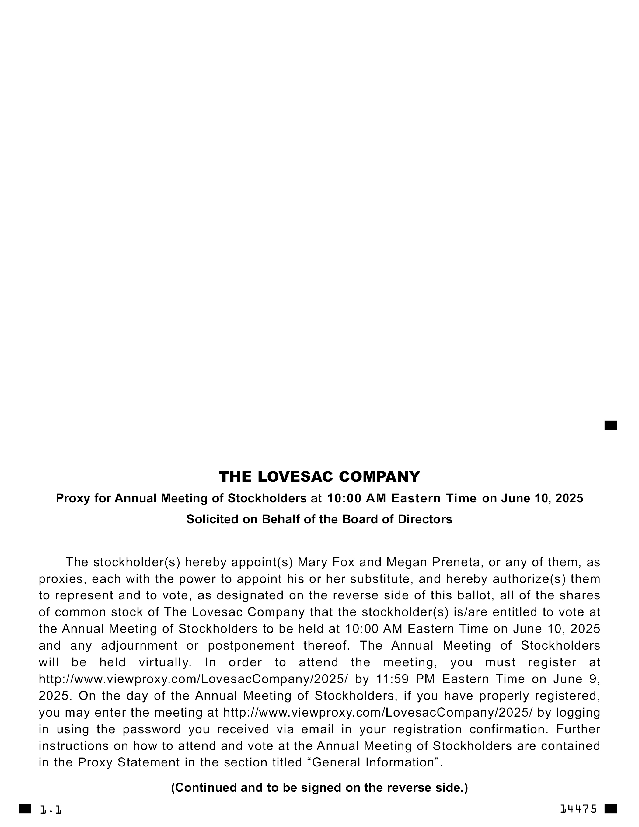 LOVESAC公司于美国东部时间2025年6月10日上午10:00召开的年度股东大会的代理人代表董事会征集股东特此委任Mary Fox和Megan Preneta或他们中的任何人为代理人,各自有权指定其替代人选,并在此授权他们代表并投票,如在本次投票反面指定的,该股东(s)有权在美国东部时间2025年6月10日上午10:00举行的年度股东大会及其任何延期或延期举行的股东大会上投票的The Lovesac Company的所有普通股股份。年度股东大会将以虚拟方式召开。要参加会议,必须在美国东部时间2025年6月9日晚上11:59前在http://www.viewproxy.com/LovesacCompany/2025/注册。在股东年会当天,如果您已正确注册,您可以使用您在注册确认中通过电子邮件收到的密码登录http://www.viewproxy.com/LovesacCompany/2025/进入会议。关于如何出席股东年会并在会上投票的进一步说明,载于标题为“一般信息”一节的代理声明中。(续并于反面签署。)1.114475