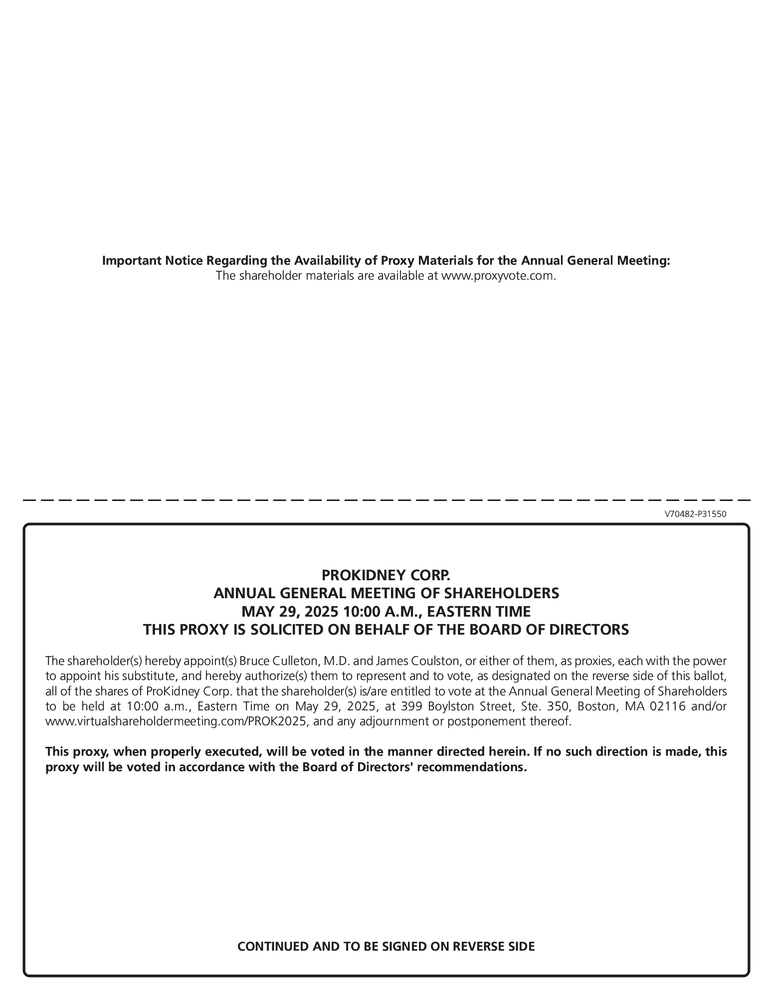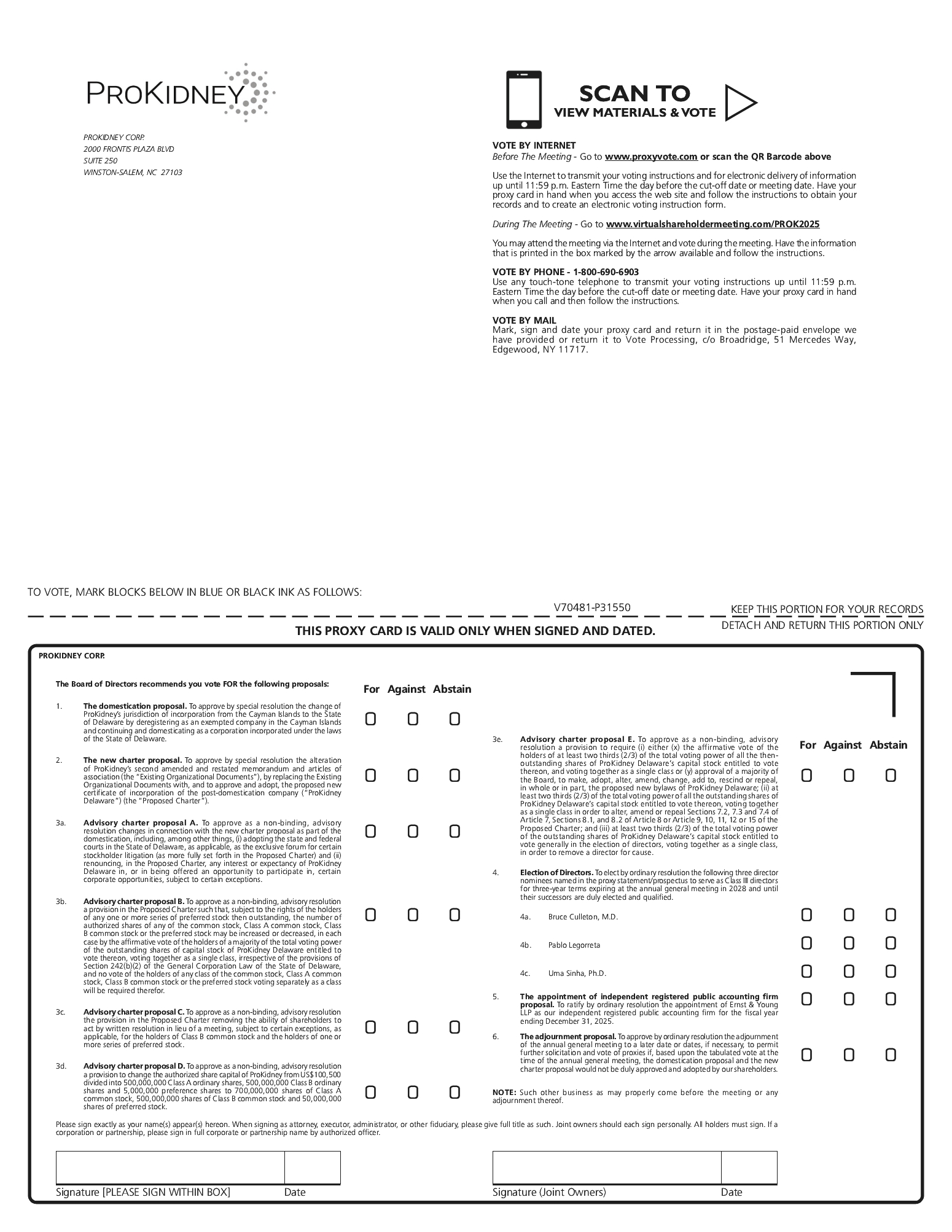 诚邀您参加开曼群岛豁免公司ProKidney Corp.(“ProKidney”、“公司”、“我们”、“我们”或“我们的”)将于美国东部时间2025年5月29日上午10:00在Boston,MA 02116,Boylston Street,Ste. 350,399举行的2025年年度股东大会(“年度股东大会”)。
