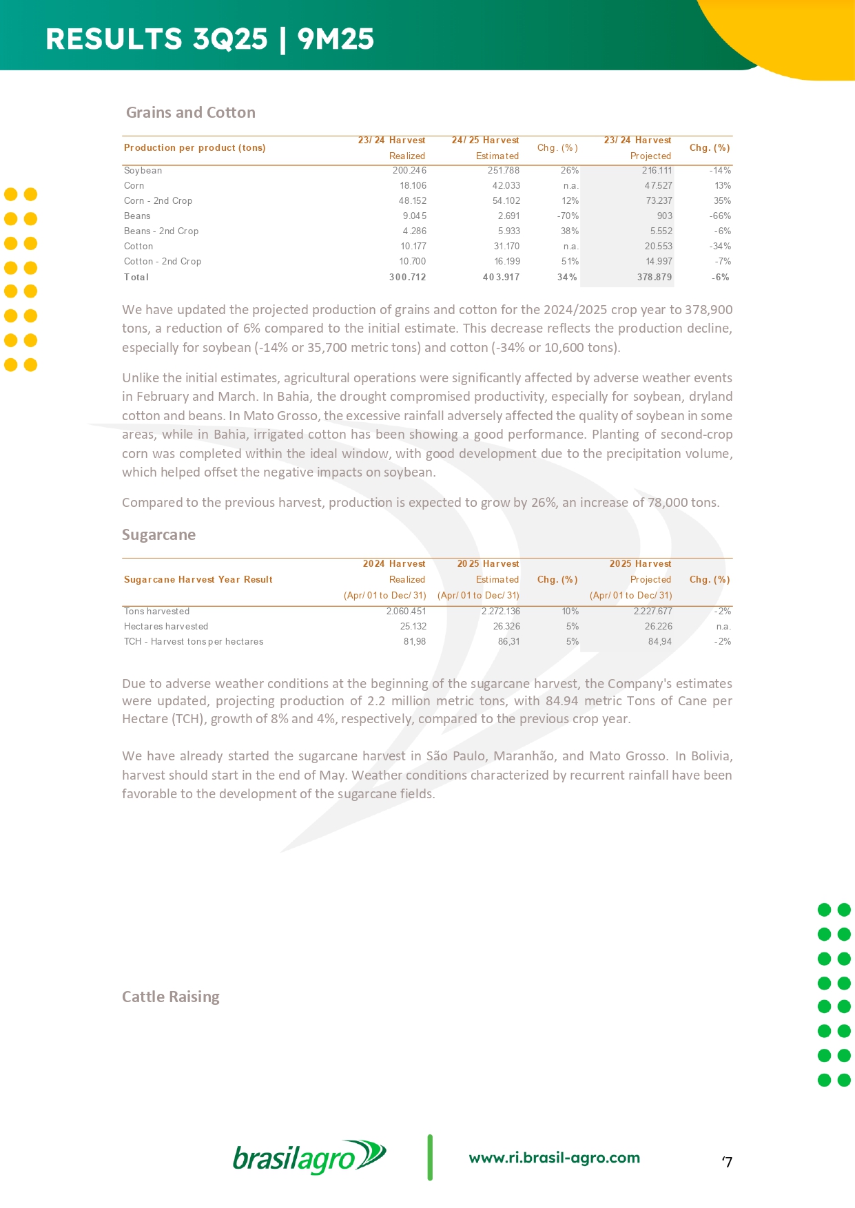 谷物和棉花‘7我们将2024/2025作物年度谷物和棉花的预计产量更新为378,900吨,与最初的估计相比减少了6%。这一下降反映了产量下降,尤其是大豆(-14 %或35,700公吨)和棉花(-34 %或10,600吨)。与最初的估计不同,农业经营在2月和3月受到不利天气事件的显着影响。在巴伊亚,干旱影响了生产力,尤其是大豆、旱地棉花和豆类。在马托格罗索州,过量降雨对一些地区的大豆质量造成不利影响,而在巴伊亚州,灌溉棉花一直表现良好。二茬玉米播种在理想窗口内完成,因降水量发展良好,有助于抵消对大豆的负面影响。与上次收获相比,预计产量将增长26%,增加7.8万吨。由于甘蔗收割开始时的不利天气条件,该公司的估计被更新,预计产量为2。200万吨,84。每公顷(TCH)种植94公吨甘蔗,与上一作物年度相比分别增长8%和4%。我们已经开始了圣保罗、马拉尼昂和马托格罗索州的甘蔗收割工作。在玻利维亚,收获应该在5月底开始。以反复降雨为特征的天气条件一直有利于甘蔗田的发展。养牛24/25 Ha rvest 23/24 Ha rvest 23/24 Ha rvest chg。(%)预计CHG。(%)估计每产品实现产量(吨)-14% 216.11 126% 251.788200.246大豆13% 47.527 n.a. 42.03 318.10 6玉米35% 73.23712% 54.10 248.15 2玉米-第二季作物-66% 903-70% 2.69 19.04 5豆-6% 5.55 238% 5.93 34.286豆-第二季作物-34% 20.553 n.a. 31.17 0 10.17 7棉花-7% 14.99 751% 16.19910.700棉花-第二季作物-6% 378.87 934% 403.9 17300.712 Tota l甘蔗2025 Ha RVest 2025 Ha RVest 2024 Ha RVest CHG。(%)预计CHG。(%)估计已实现的Suga rca ne ha rvest yea r结果(Apr/01至Dec/31)(Apr/01至Dec/31)(Apr/01至Dec/31)-2% 2.227.67 710% 2.27 2.13 62.06 0.451吨收获n.a. 26.2265% 26.32625.13 2公顷收获-2% 84,945% 86,3181,98 TCH-每公顷收获吨