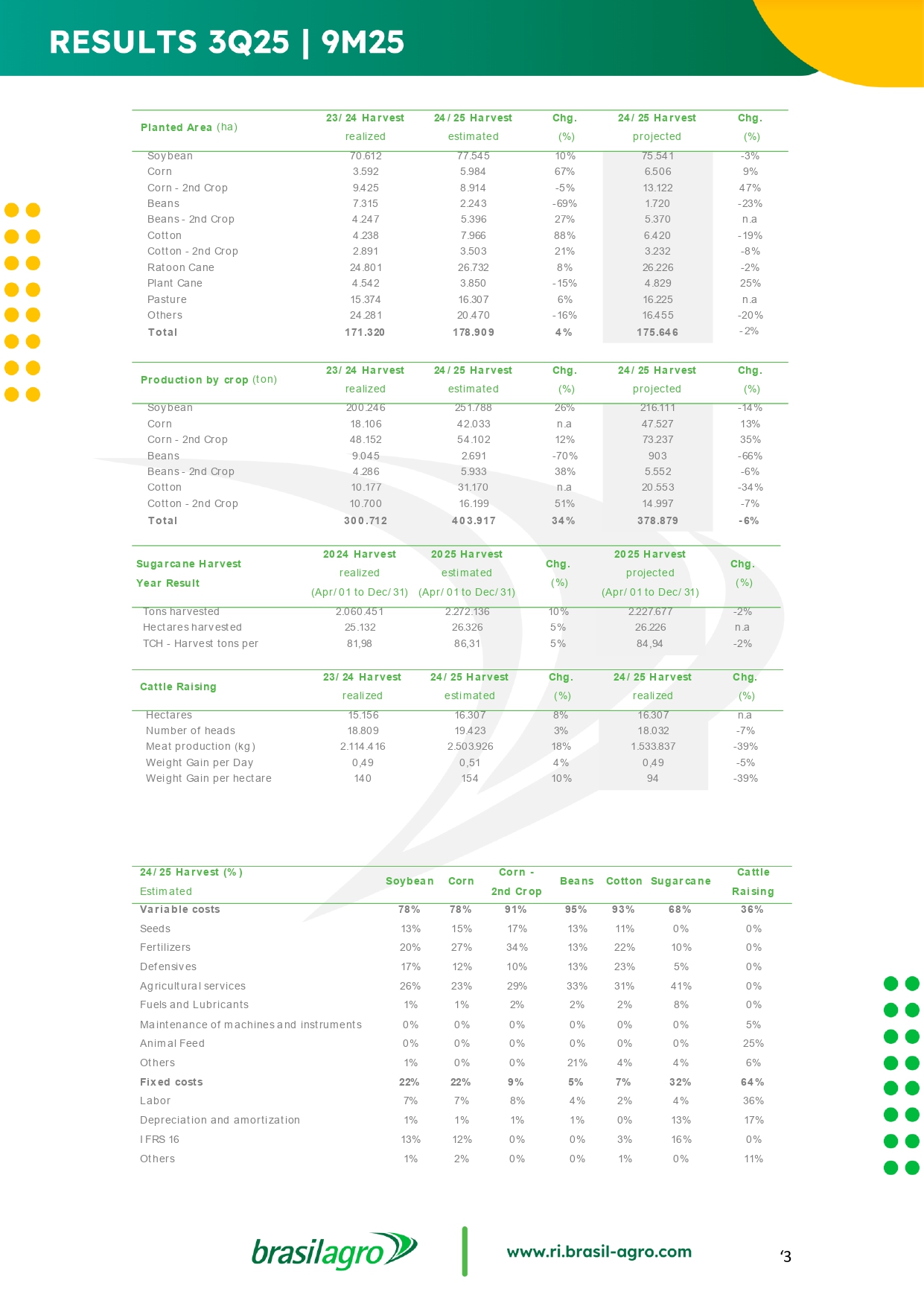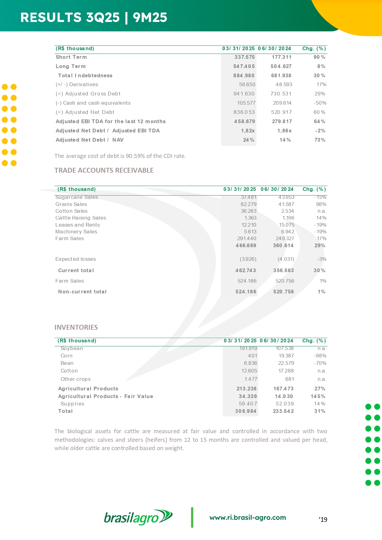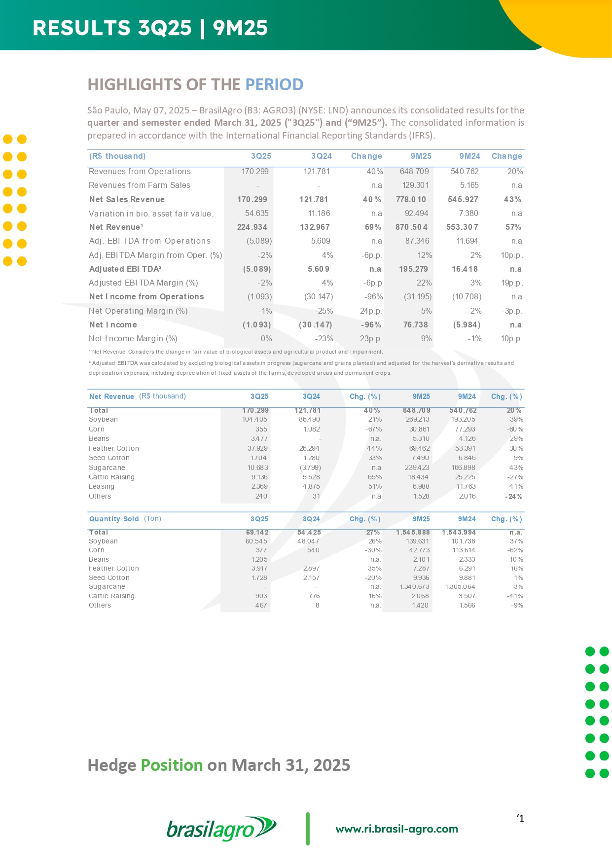 ‘1期间亮点,圣保罗,2025年5月7日– BrasilAgro(B3:AGRO 3)(NYSE:LND)公布截至2025年3月31日止季度和学期(“Q3 Q25”)和(“9 M25”)的综合业绩。合并信息是根据国际财务报告准则(IFRS)编制的。2025年3月31日对冲头寸Cha nge 9m24 9m25 Cha nge 3 Q24 3 Q25(R $ thousand nd)20% 540.76 2648.70 940% 121.78 1170.299 Revenues f rom Operations n.a 5.16 5129.301 n.a--Revenues f rom Farm Sales 43% 545.9 27778.0 1040% 121.78 1170.299 Net SA les revenue n.a 7.38092.494 n.a 11.18654.635 Variation in bio. a sset fair value。57% 553.307870.50469% 13 2.96 7224.934净收入丨n.a 11.69487.346 n.a 5.609(5.089)调整后EBI TDA f r om op er a t i ons 10p.p. 2% 12%-6p.p. 4%-2%调整后EBI TDA Margin f rom op.(%)n.a 16.4 18195.279 n.a 5.609(5.089)调整后EBI TDA ² 19p.p. 3% 22%-6p.p 4%-2%调整后EBI TDA Margin(%)n.a(10.708)(31.195)-96%(30.147)(1.093)Net i ncome from operations-3p.p.-2%-5% 24p.p.-25%-1%n.a(5.984)76.738-96%(30.147)(1.093)Net i ncome 10p.p.-1% 9% 23p.p.-23% 0% Net i ncome margin(%)丨净收入:考虑s生物资产和agricultur al product的f air value和i mpairment的变化。²调整后EBI TDA的计算方法是不包括在产生物资产(甘蔗和种植的谷物)和调整后的f或收获的衍生结果和折旧费用,包括f arm s、发达地区和永久cr ops的f ixed资产的折旧。CHG。(%)9m24 9m25 CHG。(%)3Q24 3Q25净收入(千雷亚尔)20% 540.76 2648.70940% 121.78 1170.299合计39% 193.205269.21321% 86.490104.405大豆-60% 77.29 330.861-67% 1.08 2355玉米29% 4.12 65.3 10 n.a.-3.477豆30% 53.39 169.46 244% 26.29437.9 29羽棉9% 6.8467.49033% 1.2801.704籽棉43% 166.89 8239.423 n.a(3.799)10.683甘蔗-27% 25.2 2518.43465% 5.5289.136养牛-41% 11.76 36.988-51% 4.87 52.369租赁-24% 2.01 61.528 n.a 31240其他CHG(%)9m24 9m25 CHG。(%)3Q24 3Q25销售数量(吨)n.a. 1.54 3.9941.5 45.88827% 54.42569.14 2合计37% 101.73 8139.63 126% 48.04760.545大豆-62% 113.61 442.773-30% 540377玉米-10% 2.33 32.10 1 n.a.-1.205豆16% 6.29 17.28735% 2.89 73.917羽棉1% 9.88 19.936-20% 2.1571.728籽棉3% 1.305.06 41.34 0.673 n.a.--甘蔗-41% 3.5072.06816% 776903养牛-9% 1.5661.420 n.a. 8467其他