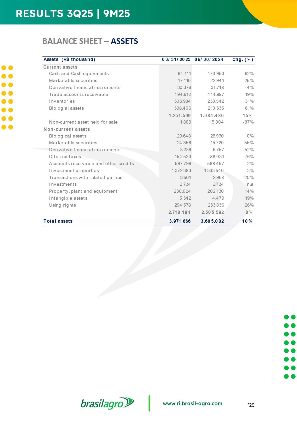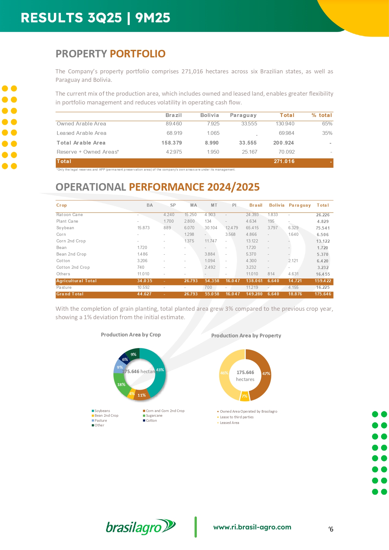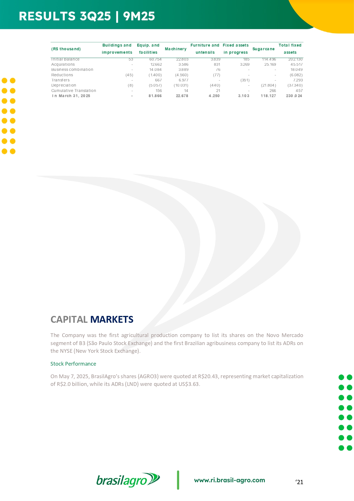 ‘1期间亮点,圣保罗,2025年5月7日– BrasilAgro(B3:AGRO 3)(NYSE:LND)公布截至2025年3月31日止季度和学期(“Q3 Q25”)和(“9 M25”)的综合业绩。合并信息是根据国际财务报告准则(IFRS)编制的。2025年3月31日对冲头寸Cha nge 9m24 9m25 Cha nge 3 Q24 3 Q25(R $ thousand nd)20% 540.76 2648.70 940% 121.78 1170.299 Revenues f rom Operations n.a 5.16 5129.301 n.a--Revenues f rom Farm Sales 43% 545.9 27778.0 1040% 121.78 1170.299 Net SA les revenue n.a 7.38092.494 n.a 11.18654.635 Variation in bio. a sset fair value。57% 553.307870.50469% 13 2.96 7224.934净收入丨n.a 11.69487.346 n.a 5.609(5.089)调整后EBI TDA f r om op er a t i ons 10p.p. 2% 12%-6p.p. 4%-2%调整后EBI TDA Margin f rom op.(%)n.a 16.4 18195.279 n.a 5.609(5.089)调整后EBI TDA ² 19p.p. 3% 22%-6p.p 4%-2%调整后EBI TDA Margin(%)n.a(10.708)(31.195)-96%(30.147)(1.093)Net i ncome from operations-3p.p.-2%-5% 24p.p.-25%-1%n.a(5.984)76.738-96%(30.147)(1.093)Net i ncome 10p.p.-1% 9% 23p.p.-23% 0% Net i ncome margin(%)丨净收入:考虑s生物资产和agricultur al product的f air value和i mpairment的变化。²调整后EBI TDA的计算方法是不包括在产生物资产(甘蔗和种植的谷物)和调整后的f或收获的衍生结果和折旧费用,包括f arm s、发达地区和永久cr ops的f ixed资产的折旧。CHG。(%)9m24 9m25 CHG。(%)3Q24 3Q25净收入(千雷亚尔)20% 540.76 2648.70940% 121.78 1170.299合计39% 193.205269.21321% 86.490104.405大豆-60% 77.29 330.861-67% 1.08 2355玉米29% 4.12 65.3 10 n.a.-3.477豆30% 53.39 169.46 244% 26.29437.9 29羽棉9% 6.8467.49033% 1.2801.704籽棉43% 166.89 8239.423 n.a(3.799)10.683甘蔗-27% 25.2 2518.43465% 5.5289.136养牛-41% 11.76 36.988-51% 4.87 52.369租赁-24% 2.01 61.528 n.a 31240其他CHG(%)9m24 9m25 CHG。(%)3Q24 3Q25销售数量(吨)n.a. 1.54 3.9941.5 45.88827% 54.42569.14 2合计37% 101.73 8139.63 126% 48.04760.545大豆-62% 113.61 442.773-30% 540377玉米-10% 2.33 32.10 1 n.a.-1.205豆16% 6.29 17.28735% 2.89 73.917羽棉1% 9.88 19.936-20% 2.1571.728籽棉3% 1.305.06 41.34 0.673 n.a.--甘蔗-41% 3.5072.06816% 776903养牛-9% 1.5661.420 n.a. 8467其他
