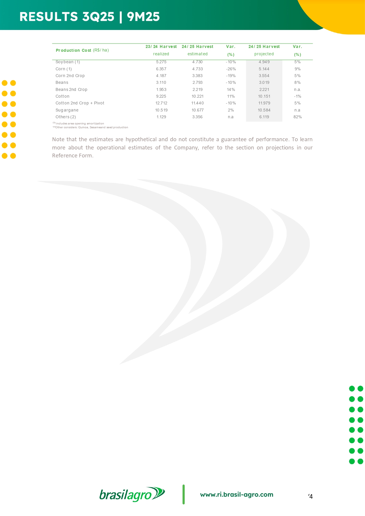 请注意,这些估计是假设的,并不构成业绩的保证。要了解有关公司运营估计的更多信息,请参阅我们的参考表格中关于预测的部分。‘4 var。24/25收获变种。24/25收获23/24收获(%)预计(%)估计实现生产成本(R $/ha)5% 4.949-10% 4.73 05.275大豆(1)9% 5.14 4-26% 4.73 36.357玉米(1)5% 3.554-19% 3.3834.18 7玉米第二季8% 3.019-10% 2.79 33.110豆n.a. 2.22114% 2.2 191.953豆第二季-1% 10.15 111% 10.22 19.225棉花5% 11.979-10% 11.4 4012.7 12棉花第二季+枢轴n.a 10.5842% 10.67710.5 19糖钢82% 6.119 n.a 3.3561.129其他(2)(1)包括面积开放摊销离子(2)其他考虑:藜麦,Sesam eand种子生产