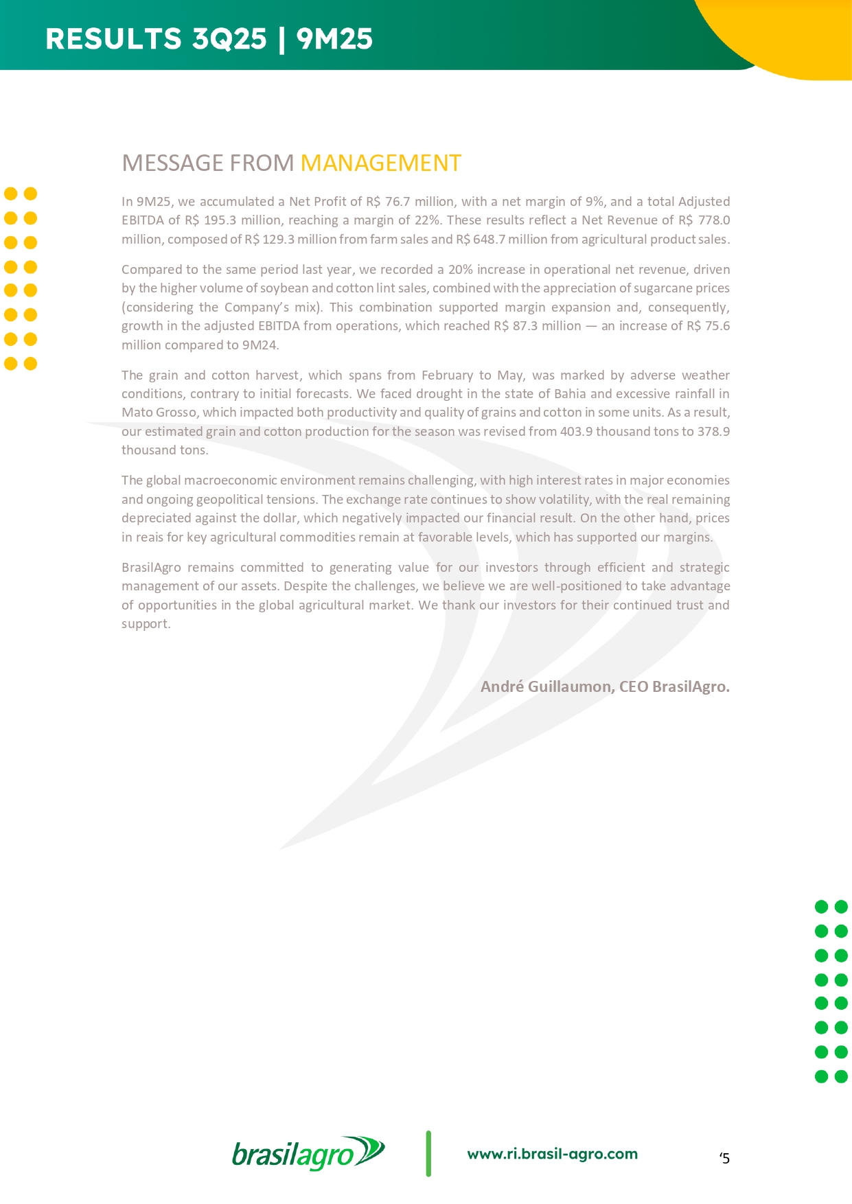 来自管理层的消息在9米25中,我们积累了76雷亚尔的净利润。700万,净利率为9%,调整后EBITDA总额为195雷亚尔。300万,达到22%的幅度。这些结果反映了778雷亚尔的净收入。0万雷亚尔,由129雷亚尔组成。300万来自农场销售,648雷亚尔。700万来自农产品销售。与去年同期相比,我们录得运营净收入增长20%,这是由于大豆和棉皮棉销售量增加,加上甘蔗价格升值(考虑到公司的组合)。这一组合支持了利润率扩张,因此,来自运营的调整后EBITDA增长,达到87雷亚尔。300万——增加75雷亚尔。600万,而9米24。粮食和棉花收获时间跨度为2月至5月,其特点是不利的天气条件,与最初的预测相反。我们面临巴伊亚州的干旱和马托格罗索州的过度降雨,这影响了一些单位的粮食和棉花的生产力和质量。因此,我们对当季粮棉产量的预估从403修正。0.9万吨至378。0.9万吨。全球宏观经济环境依然充满挑战,主要经济体利率高企,地缘政治紧张局势持续。汇率继续呈现波动,雷亚尔兑美元汇率继续贬值,这对我们的财务业绩产生了负面影响。另一方面,关键农产品的雷亚尔价格仍处于有利水平,这支撑了我们的利润率。BrasilAgro继续致力于通过对我们资产的高效和战略性管理为我们的投资者创造价值。尽管面临挑战,我们相信我们已做好充分准备,可以利用全球农业市场的机遇。我们感谢我们的投资者一直以来的信任和支持。‘5 Andr é Guillaumon,首席执行官BrasilAgro。